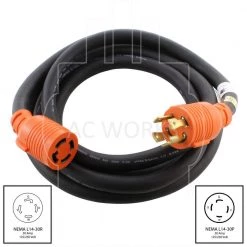 This AC WORKS brand Power Distribution Cord [L530W515] is a durable Power Cord. The cord is a NEMA L5-30P to (3) NEMA 5-15R outlets. The NEMA L5-30P is a 30 Amp, 125 Volt 3-Prong locking plug. The NEMA 5-15R is a 15 Amp regular household female connector. The connector end is a straight-blade household style. The cable is a STW, 10/3, anti-cold weather cord staying flexible in extreme temperatures. Included with your purchase is a 5-year limited warranty.