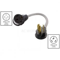 This AC WORKS brand adapter cord [S1450CB520-018] is a heavy-duty household adapter cable. This 1.5-foot cord is a NEMA 14-50P to NEMA 5-15/20R. The NEMA 14-50P is a 50 Amp, 4-Prong RV/Generator/Range male plug. The NEMA 5-15/20R is a 15/20 Amp, T-blade female connector. The cable is an STW, 10/3, anti-cold weather cable staying flexible in extreme temperatures. The cord is super durable and typically used with residential, generator, construction, and industrial equipment. Included with your purchase is a 5-year limited warranty.