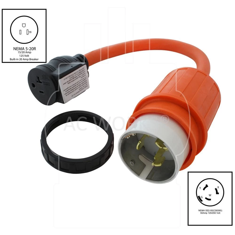 This AC WORKS brand protective adapter [SS2CB520] is a heavy-duty industrial adapter cable. This 1.5 ft. cord is a NEMA SS2-50P to NEMA 5-15/20R. The NEMA SS2-50P is a 50 Amp, 4-prong marine/industrial power distributor plug. The NEMA 5-15/20R is a 15/20 Amp, T-blade female household connector. The cable is an STW, 10/3, anti-cold weather cable staying flexible in extreme temperatures. The cord is super durable and typically used with a generator, construction, and industrial equipment. Included with your purchase is a 5-year limited warranty.