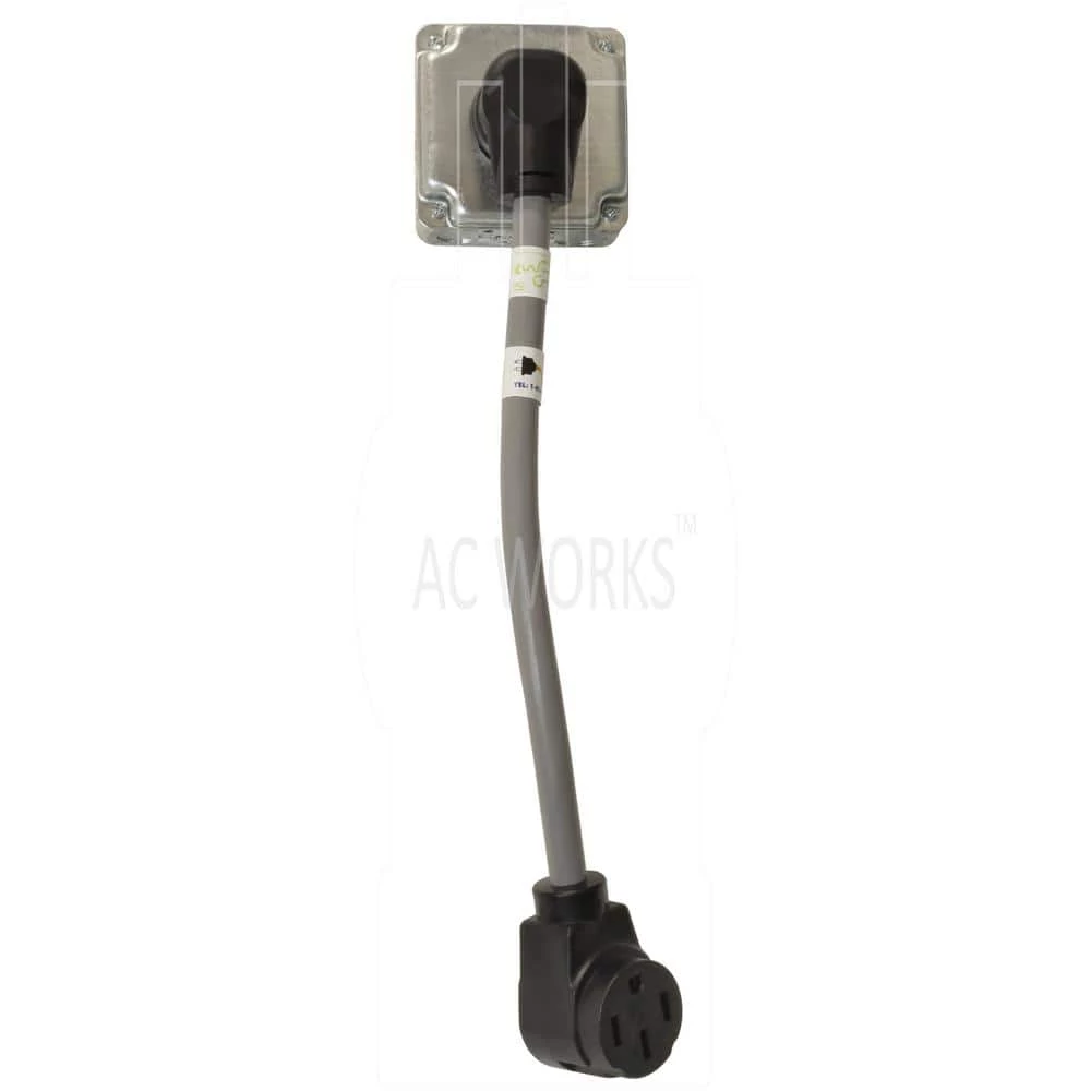 This AC WORKS brand EVSE charging adapter is made of very durable construction. It is a NEMA 10-50P to NEMA 14-50R. The NEMA 10-50P is a 50 Amp, 125/250-Volt Dryer/Welder plug. The NEMA 14-50R is a 50 Amp, 125/250-Volt EV Tesla female connector. The NEMA 10-50P gets power from a NEMA 10-50R dryer or welder socket to charge a Tesla vehicle. It has 6/2+8/1 50Amp copper wire with 300-Volt jacket. This adapter works for Tesla vehicles only. This product includes a 5-year limited warranty.