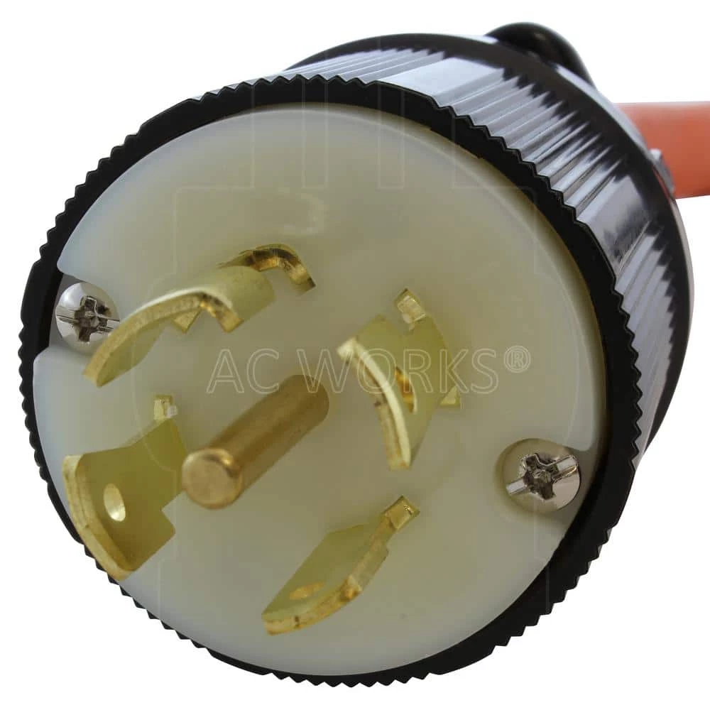 This AC WORKS brand protective power strip cord [L2130CBF520] is very durable. The cord is 1.5 ft. L and is a NEMA L21-30P to four NEMA 5-15/20R household outlets. The NEMA L21-30P is a 30 Amp, 120-Volt/208-Volt locking plug. The NEMA 5-15/20R is a 20 Amp, 125-Volt, T-blade household female connector. The cable is an STW, 10/4, 30 Amp copper wire, with a 600-Volt anti-cold weather jacket that stays flexible in extreme temperatures. The cord is super durable and typically used in convention centers, trade shows, and outdoor events. Included with your purchase is a 5-year limited warranty.