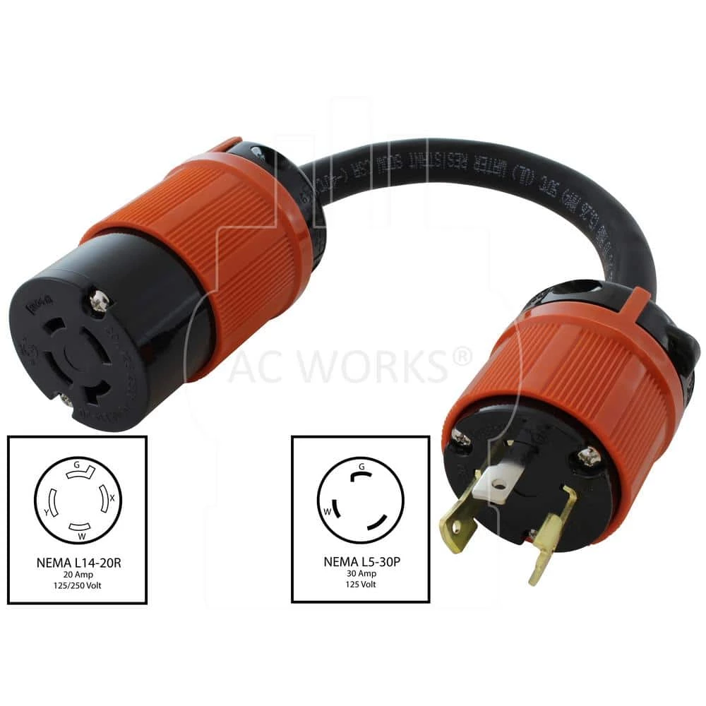 This AC WORKS brand adapter cord [L530L1420-018] is very durable. It is a NEMA L5-30P to NEMA L14-20R. The NEMA L5-30P is a 30 Amp, 125-Volt, 3-prong locking male plug. The NEMA L14-20R (hots bridged) is a 20 Amp, 4-prong locking female connector. The maximum operating power is 3750-Watt. This adapter is 1.5 ft. L and is an SOOW, 10/3, anti-cold weather cable staying flexible in extreme temperatures. Included with your purchase is a 5-year limited warranty.