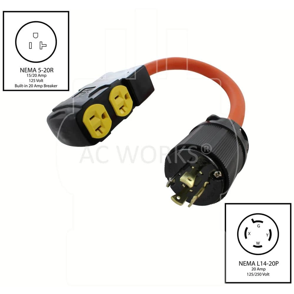 - NEMA L14-20P to NEMA 5-15/20R with 20 Amp Circuit Breaker