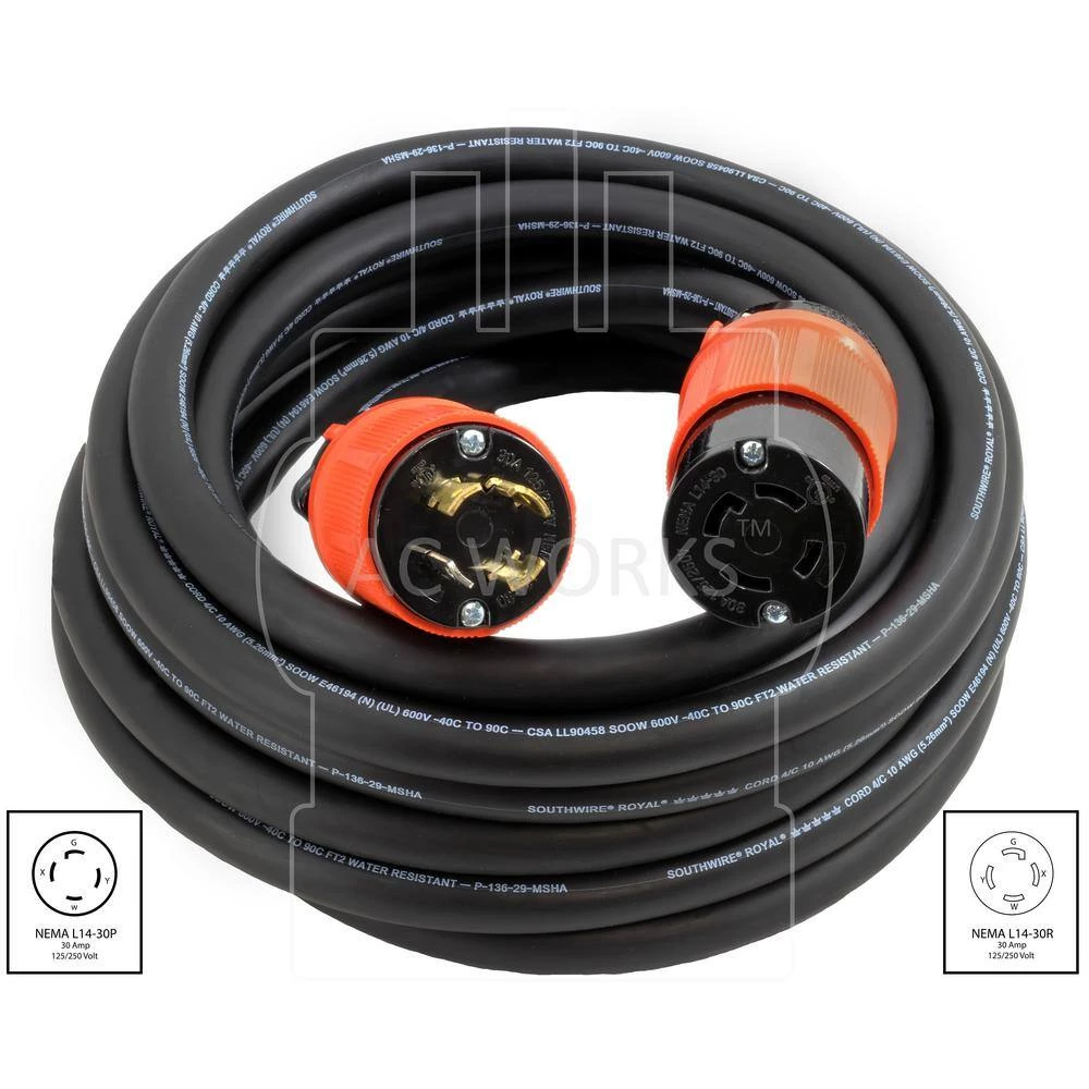 This AC WORKS brand 100 ft. L14-30 extension cord is heavy-duty and made of durable construction, the cable is Soow, 10/4, 30 Amp copper with a 600-Volt rubber jacket, the jacket will stay flexible in extremely cold weather. This cord is popular for use with transfer switches and inlet boxes, generators, industrial use and construction, the extension cord is backed with a 5-year limited warranty.