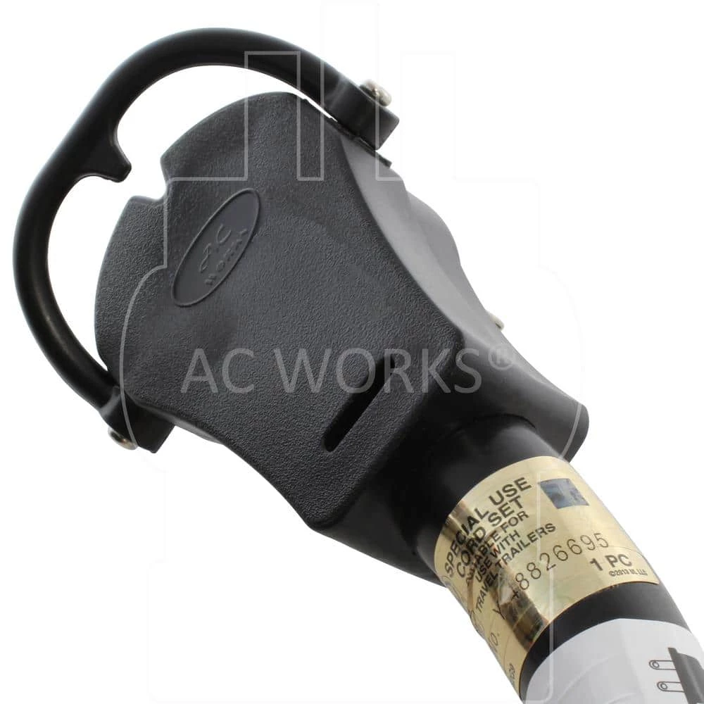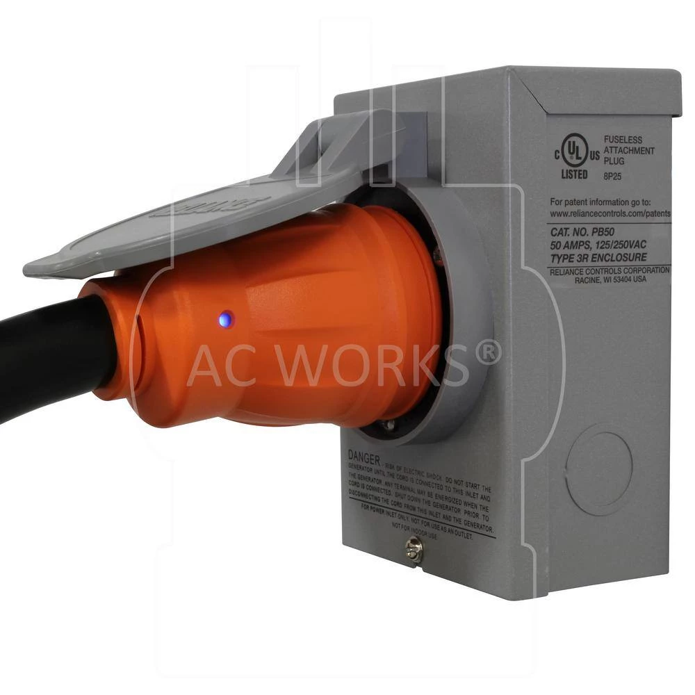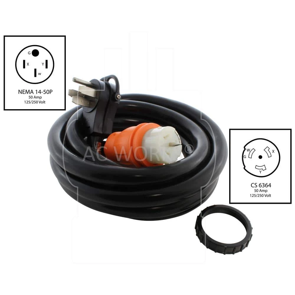 This AC WORKS brand generator transfer switch power cord [TE1450-015D] comes in a 15 ft. L. It is a NEMA 14-50P to CS6364 50A cable. The NEMA 14-50P is a 50 Amp, 125-Volt/250-Volt male plug. The CS6364 is a 50 Amp, 125-Volt/250-Volt locking female connector. The cord is an STW, 6/3 plus 8/1, heavy-duty, anti-cold weather cable that stays flexible in extreme temperatures. Included in your purchase is a 5-year limited warranty.