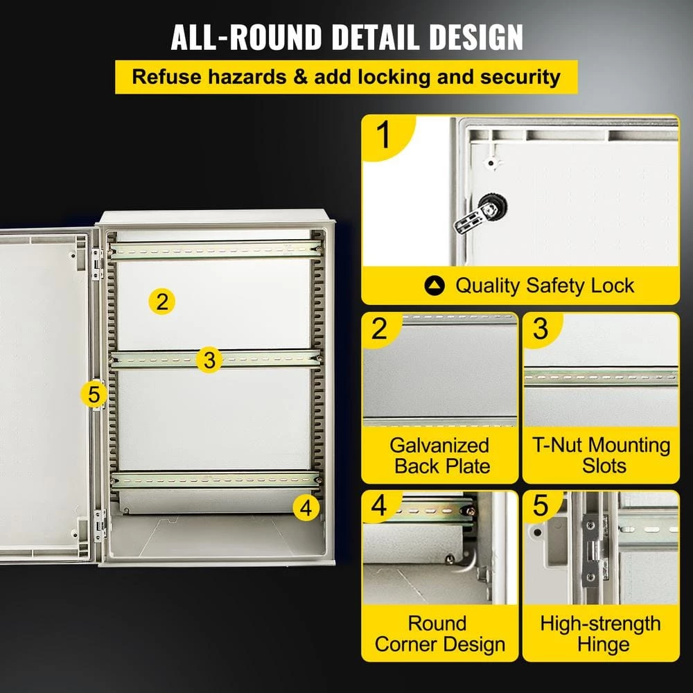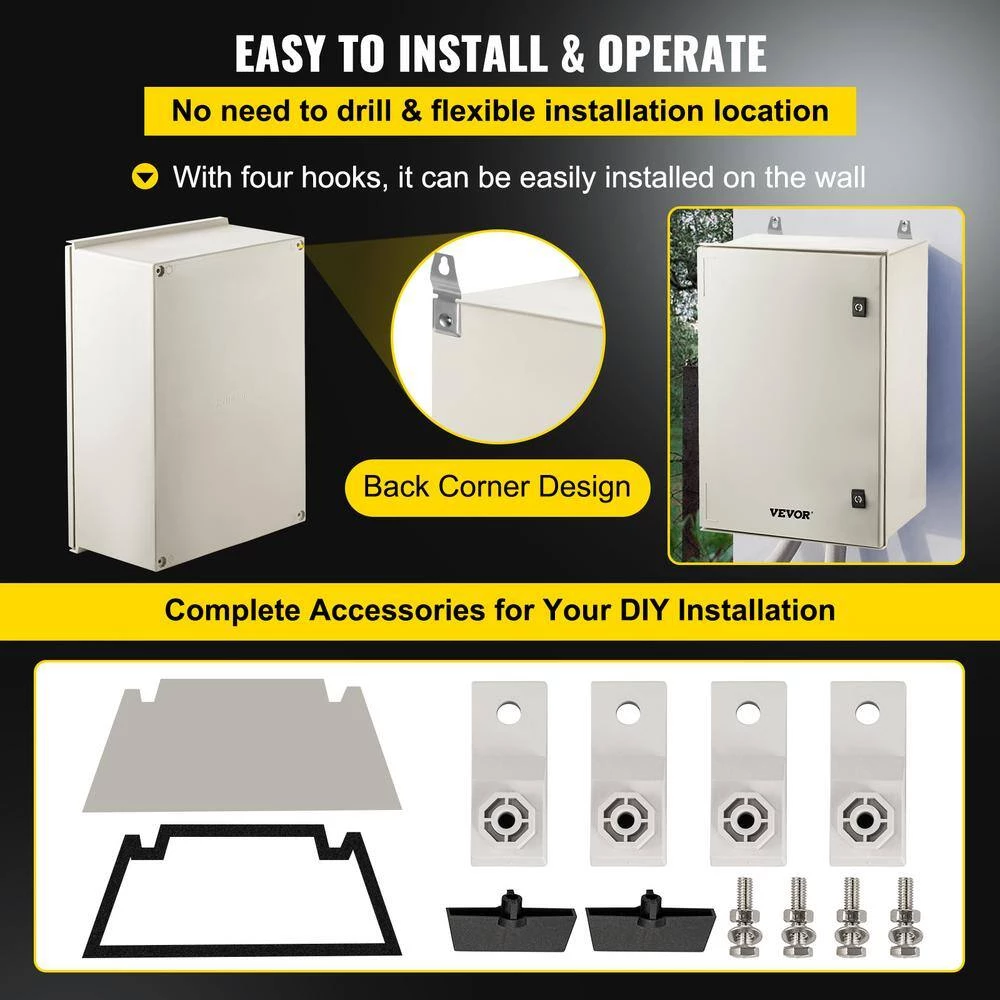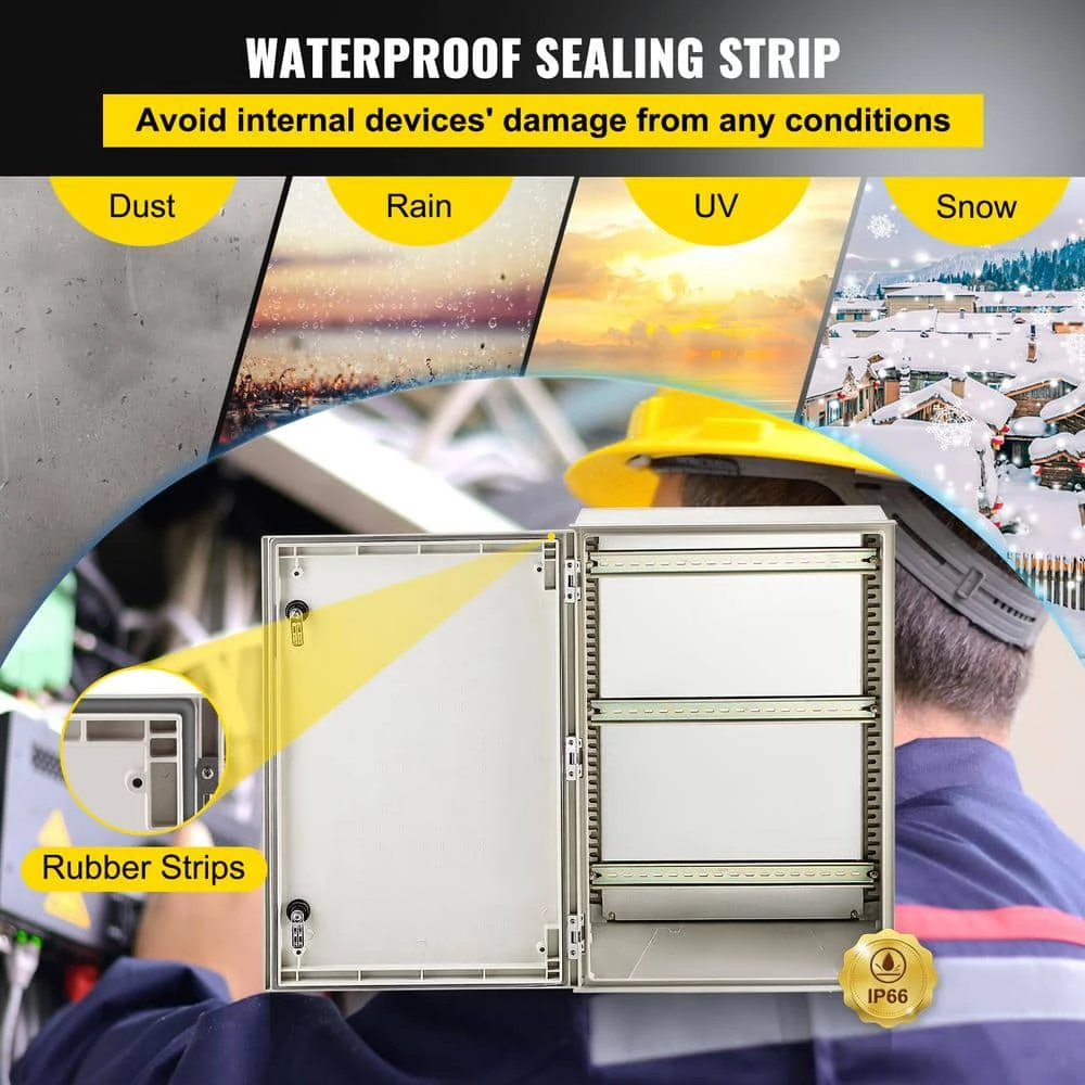 Electrical Enclosure Box–Begin your security setups! IP66 Grade, High Security and DIY Projects. The electric enclosure box is meticulously crafted from heavy-duty fiberglass reinforced polyester. Precise lock design, high-strength hinges, sealing strips, and IP66 protection grade are all used to secure your plug-ins, power cords, and other equipment in harsh environments. It is widely used for indoor and outdoor applications, such as electricity, construction, hotel, and other industries. Choose a name you can trust, VEVOR.