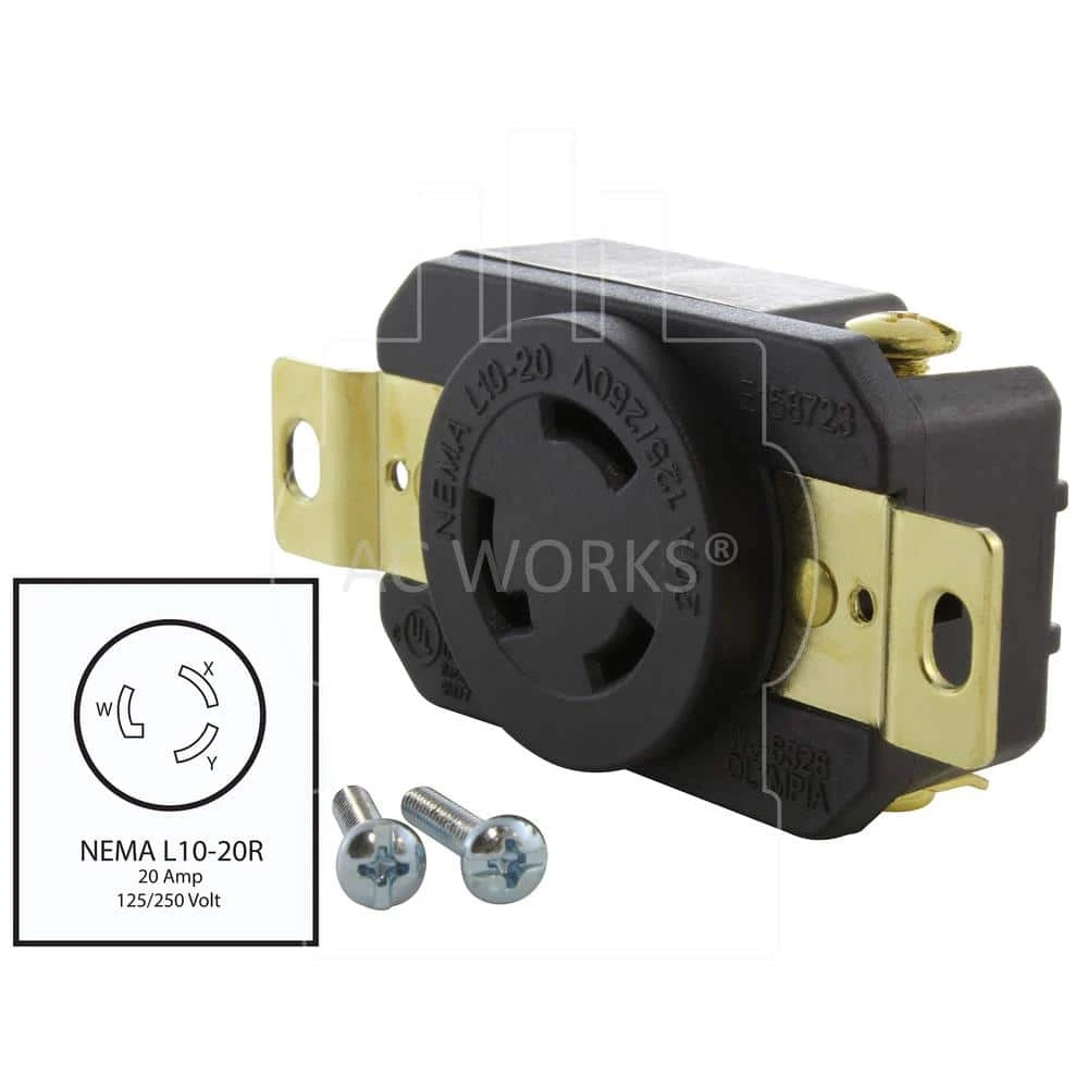 This AC WORKS brand female outlet receptacle features a 3-pole, 3-wire system. It is a NEMA L10-20R, 20 Amp, 125/250 Volt flush mount locking design. This product is installed into your generator to repair or change your generator receptacle. It features chemical and impact-resistant housing along with a quick installation process. The FML1020R is UL and C-UL certified. Included with your purchase is a 1-year limited warranty.