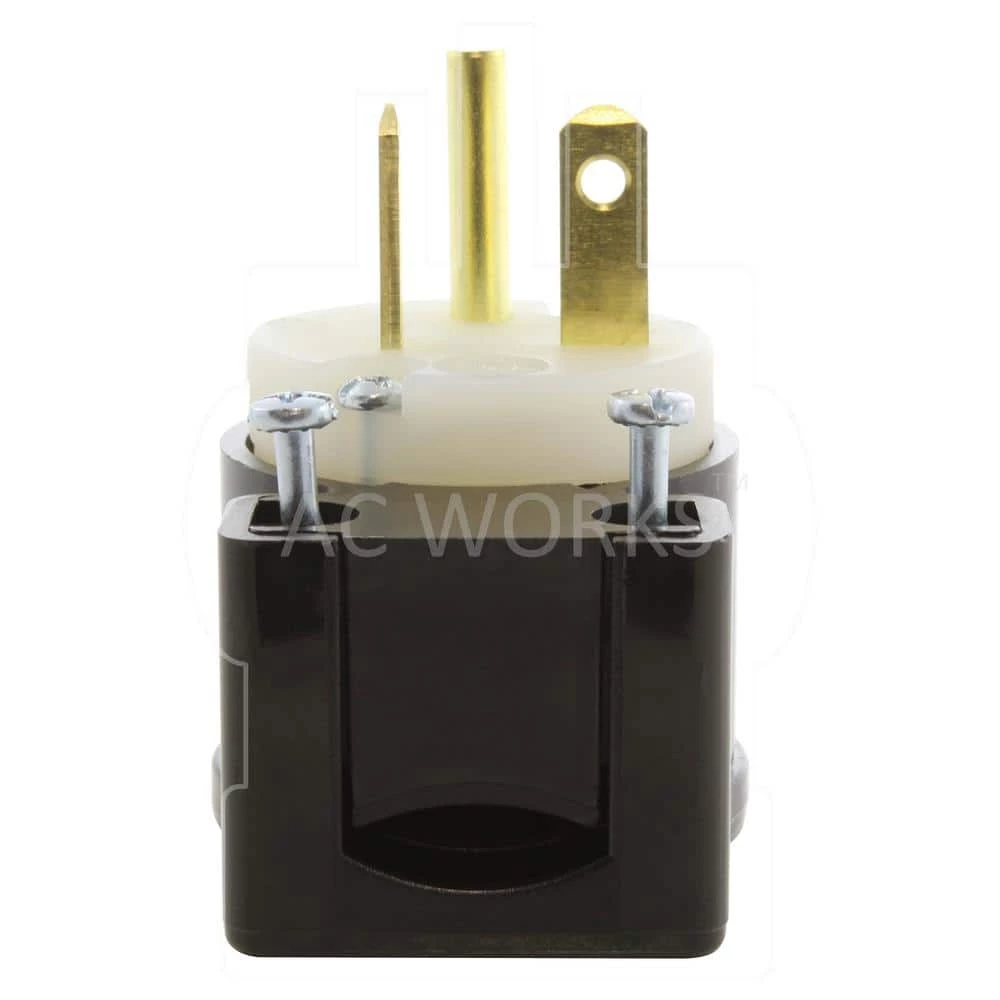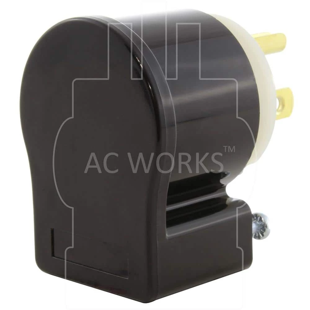 This AC WORKS brand, solid industrial grade wiring device [ASE620P] is made of very durable construction able to withstand impacts, chemicals, and weather. It is a NEMA 6-20P, 20 Amp, 250-Volt straight-blade plug. This product features a strain relief structure with SJT, SJO, SOO, STW, 12/3, 14/3, 16/3, 18/3 cable specifications. This plug will reach any angle you need. DIY products include a 1-year limited warranty.