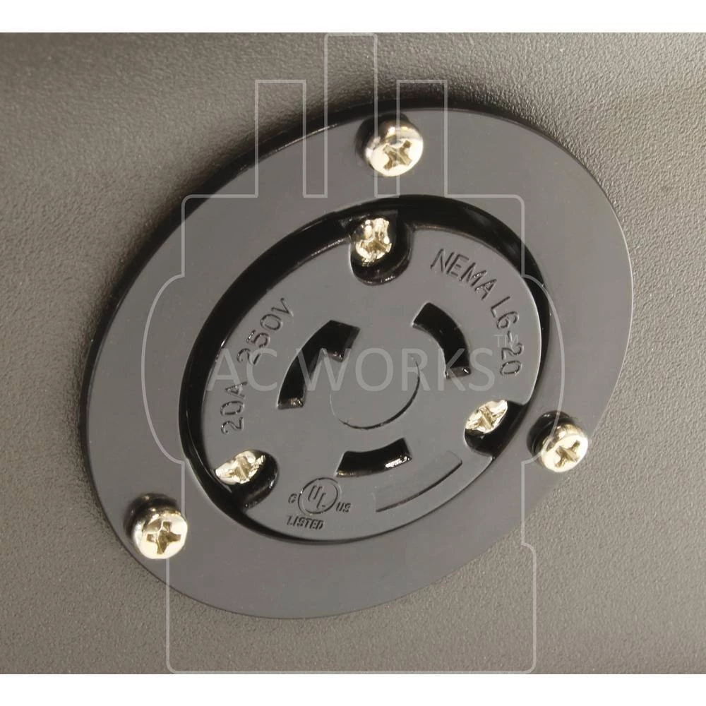This AC WORKS brand NEMA L6-20R wiring device [ASOUL620R] is a heavy-duty power outlet device. It is used for an industrial and commercial grade flange outlet. This outlet works with 10 or 12 AWG (American Wire Gauge) copper wire and is commonly used for Residential, Commercial, and Industrial power. Included with your purchase is a 1-year limited warranty.