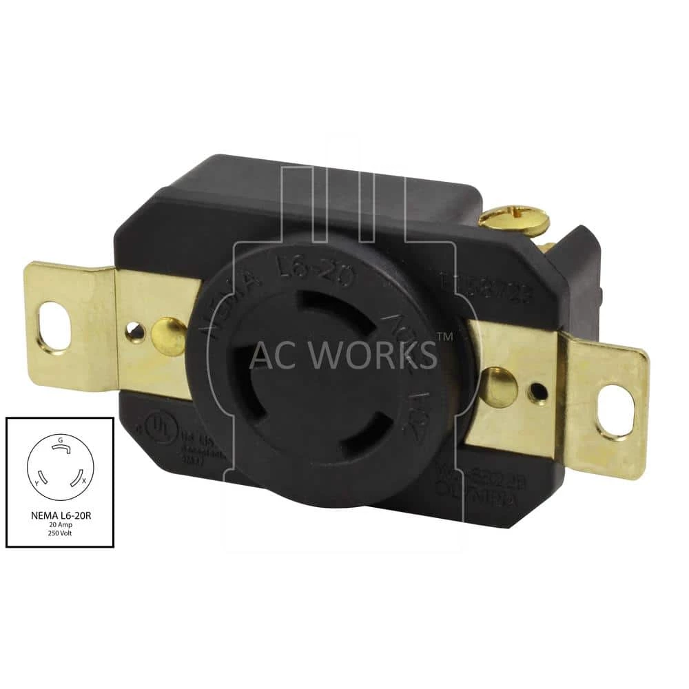 This AC WORKS brand female outlet receptacle features a 2-pole, 3-wire grounding system. It is a NEMA L6-20R, 20 Amp, 250 Volt flush mount locking design. This product is commonly installed in an industrial outlet. The receptacle features a chemical and impact resistant housing along with a quick installation process. The FML620R is UL and C-UL certified. Included with your purchase is a 1-year limited warranty.