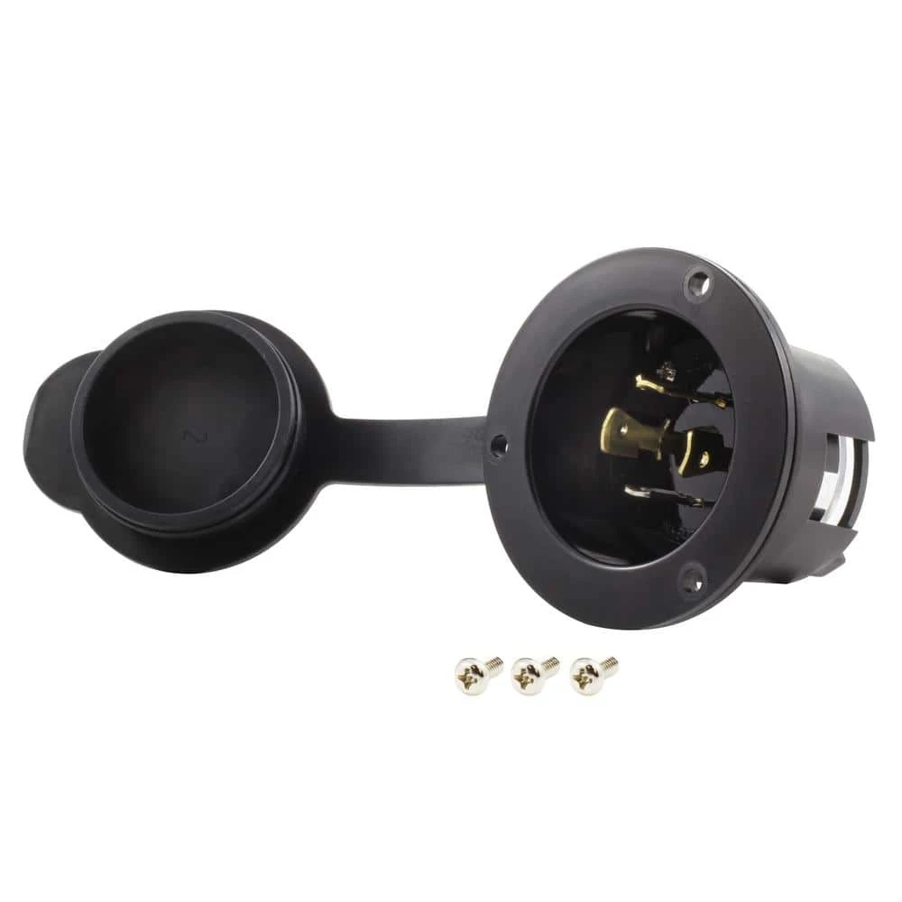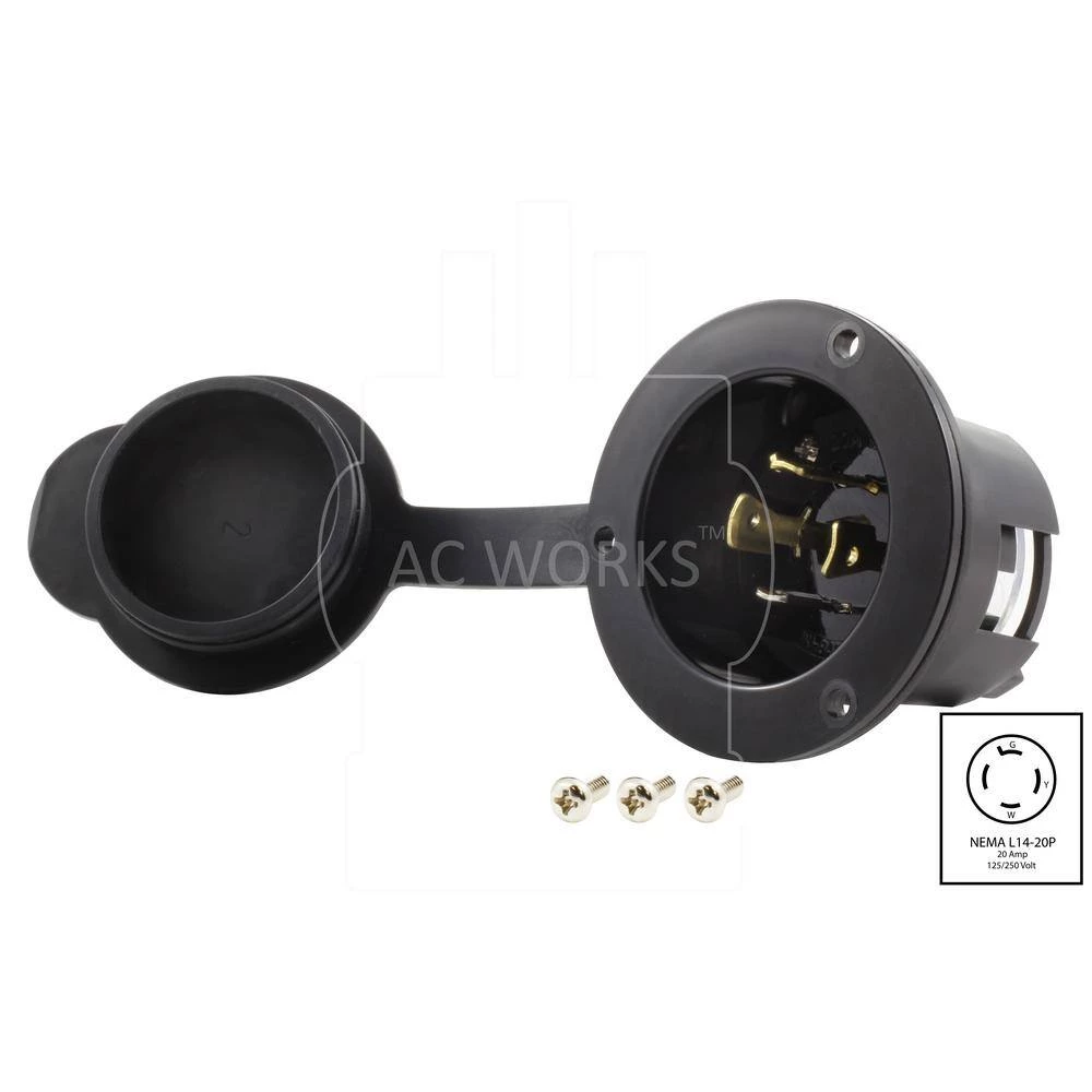 This AC works brand inlet wiring device is a heavy-duty power input connection device with weather-tight cover. It is used for an industrial and commercial grade flange inlet. This inlet works with 12 AWG (American Wire-Gauge) or above copper wire and is commonly used for residential, transfer switch, cabins and generators.