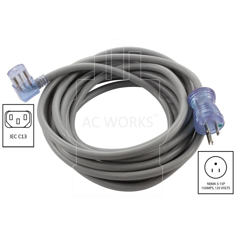 This AC WORKS brand Medical grade power cord. It is a NEMA 5-15P hospital grade power supply cord. The 20 ft. cord is an SJTW, 14/3 hospital cord. This green dot power cord is a NEMA 5-15P, 15 Amp, 125-Volt medical grade plug connected to a left angle IEC C13. Included with your purchase is a 5-year limited warranty.