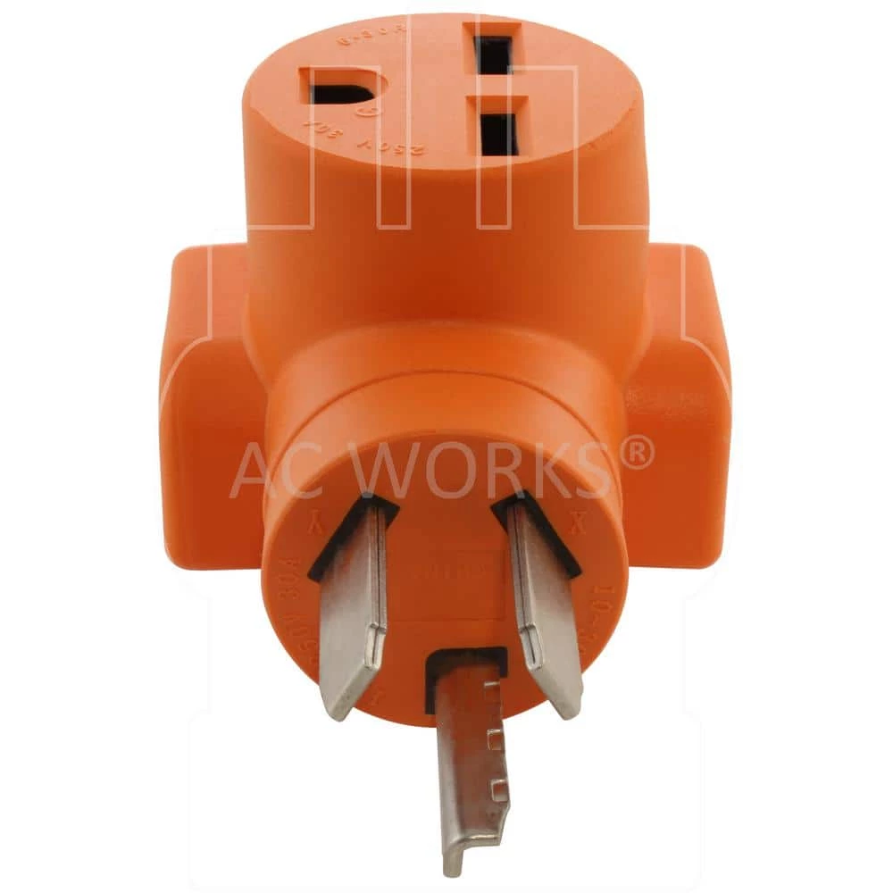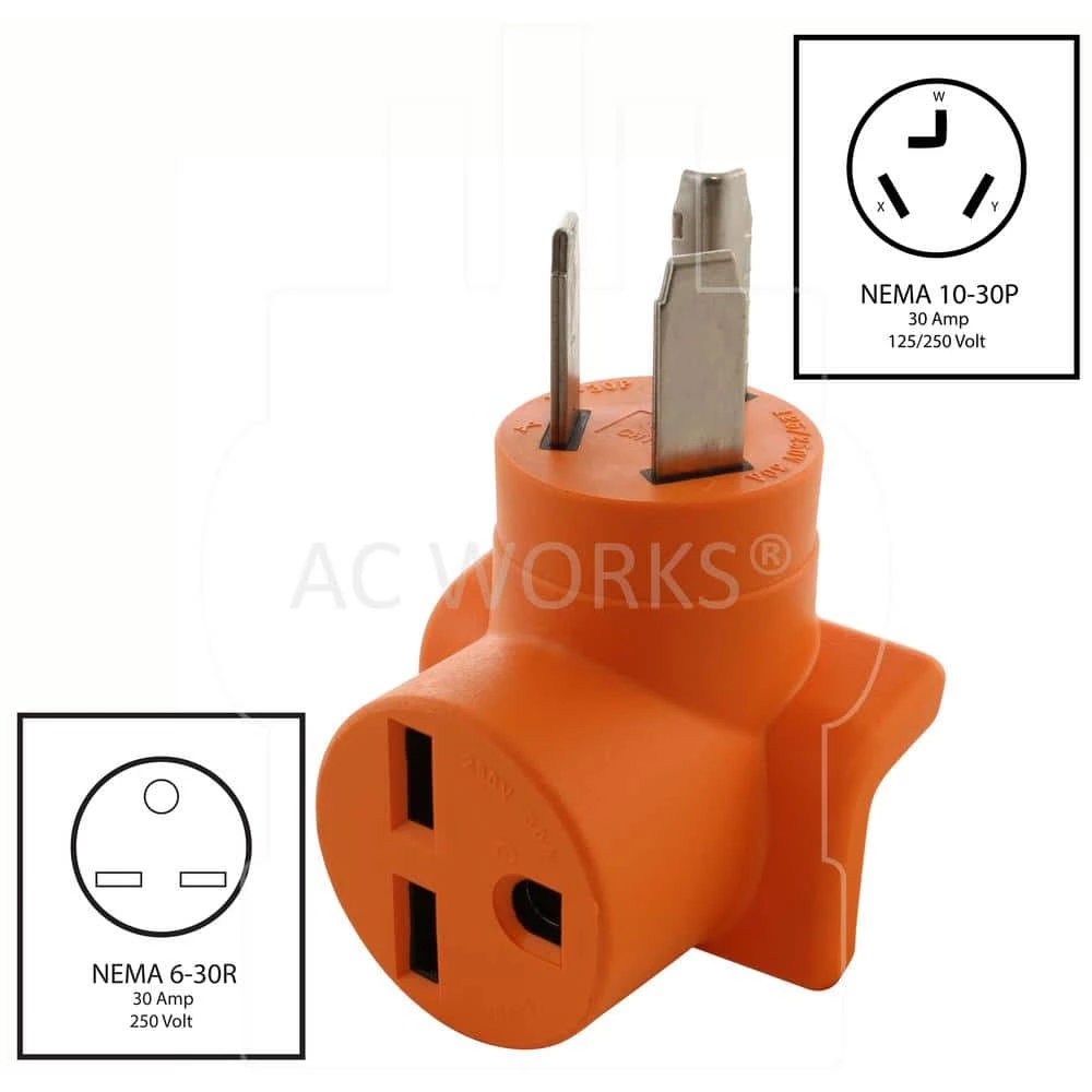 This AC WORKS brand adapter [AD1030630] is very durable with a compact design. It is a NEMA 10-30P to NEMA 6-30R. The NEMA 10-30P is a 30 Amp, 250-Volt, 3-prong dryer male plug. The NEMA 6-30R is a 30 Amp, 250-Volt, 3-prong HVAC female connector. The product is heavy-duty, compact, and contains nickel-plated plugs and terminals to prevent rusting. Included with your purchase is a 5-year limited warranty.