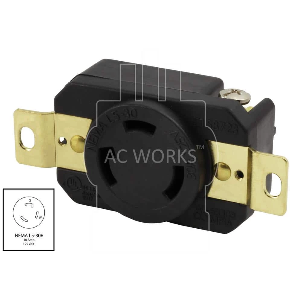 This AC WORKS brand female outlet receptacle features a 2-pole, 3-wire grounding system. It is a NEMA L5-30R, 30 Amp, 125 Volt flush mount locking design. This product is installed in the generator to fix or change its receptacle. The receptacle features a chemical and impact resistant housing along with a quick installation process. The FML5-30R is UL and C-UL certified. Included with your purchase is a 1-year limited warranty.