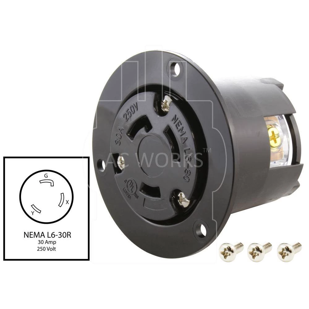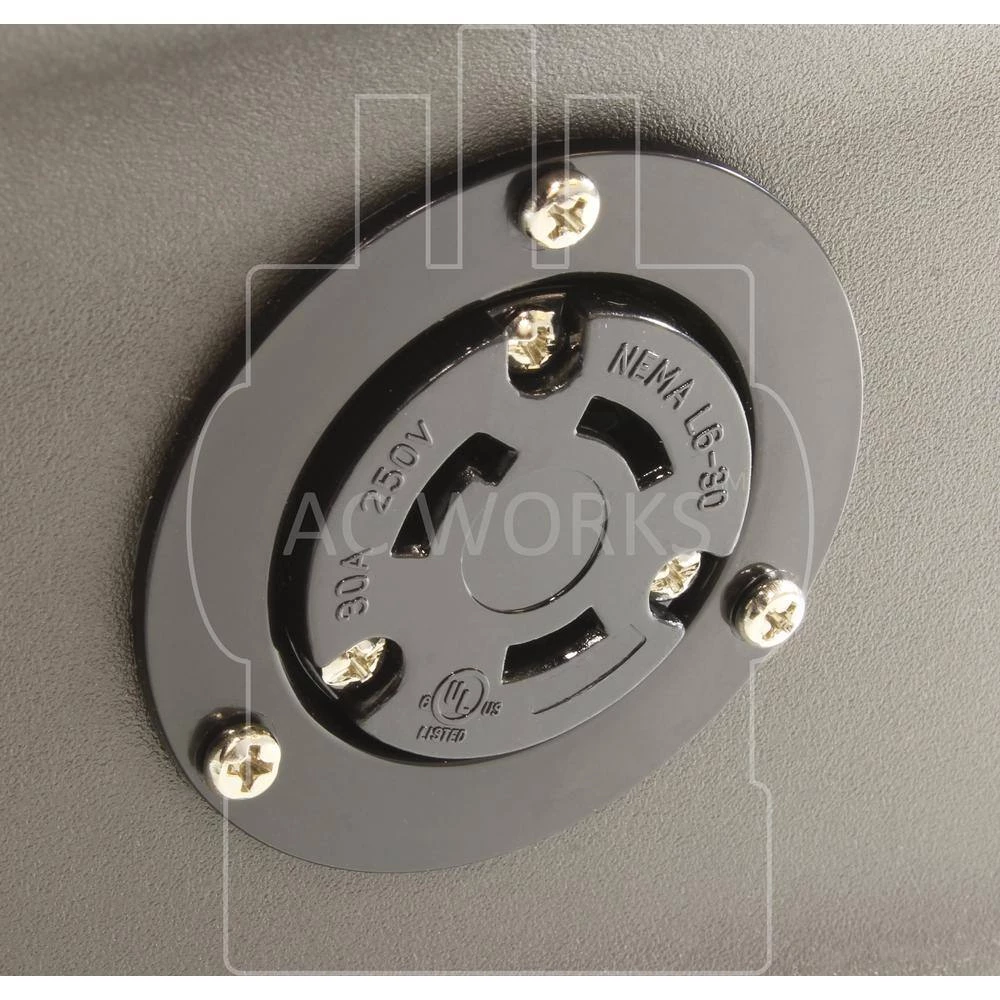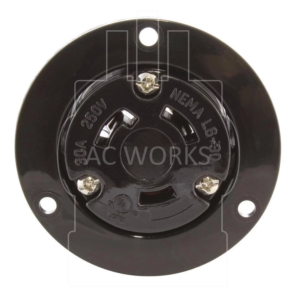This AC WORKS brand NEMA L6-30R wiring device [ASOUL630R] is a heavy-duty power outlet device. It is used for an industrial and commercial grade flange outlet. This outlet works with 10 (American Wire Gauge) copper wire and is commonly used for Residential, Commercial, and Industrial power. Included with your purchase is a 1-year limited warranty.