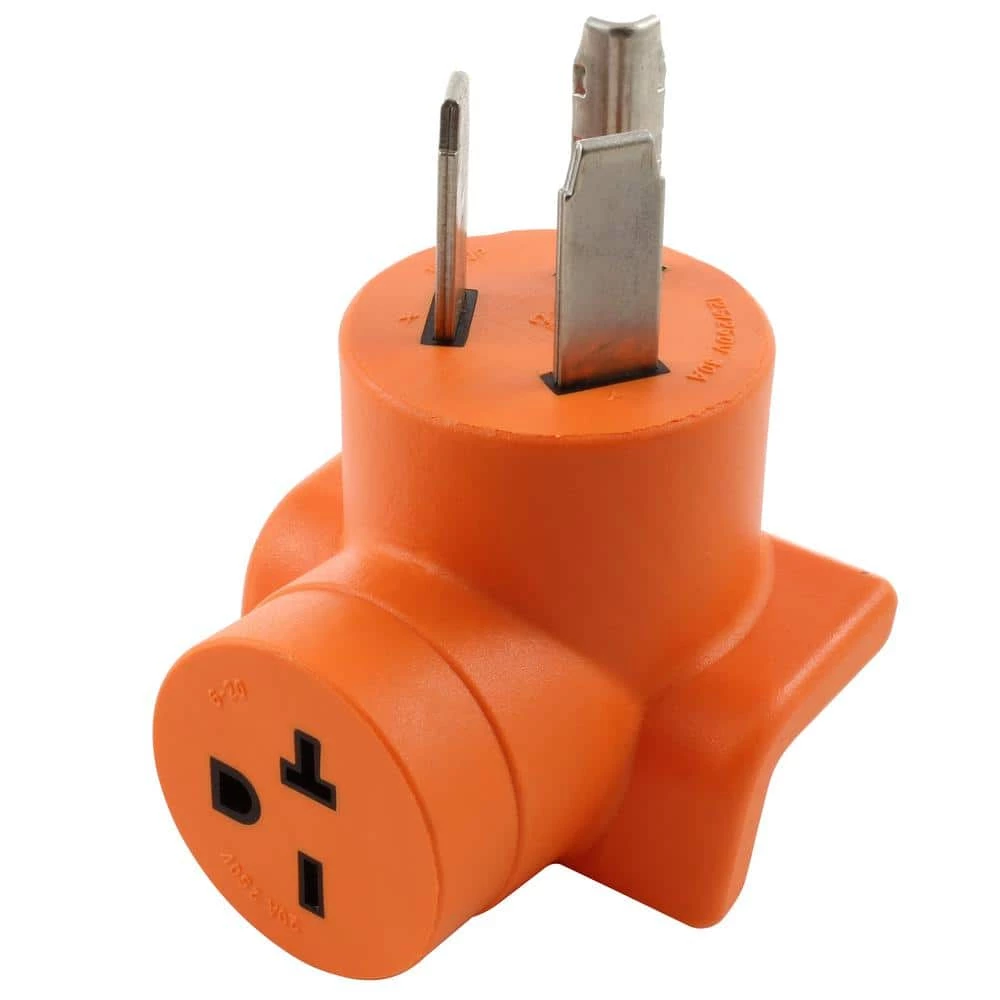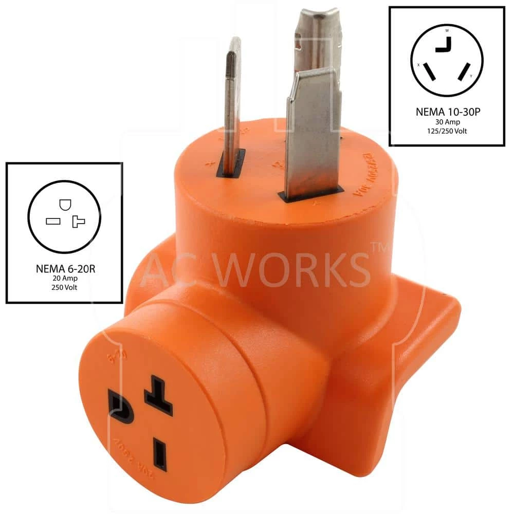 This AC WORKS brand dryer outlet adapter [AD1030620] is very durable with a compact design. It is a NEMA 10-30P to NEMA 6-20R. The NEMA 10-30P is a 30 Amp, 125-Volt/250-Volt, 3-prong dryer outlet plug. The NEMA 6-20R, 15/20 Amp, 250-Volt HVAC/Power tools female connector. The product is heavy-duty, compact and contains nickel-plated plugs and terminals to prevent rusting. The maximum operational power is 5000-Watt.