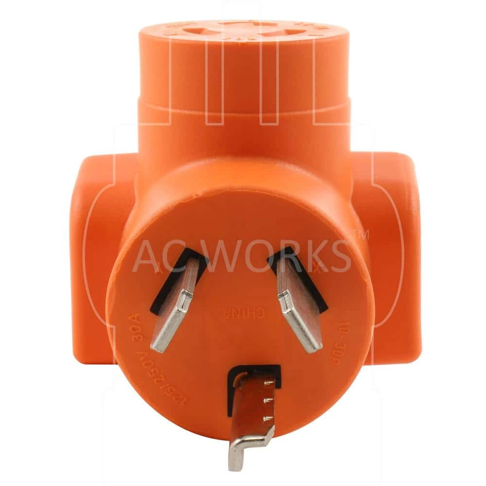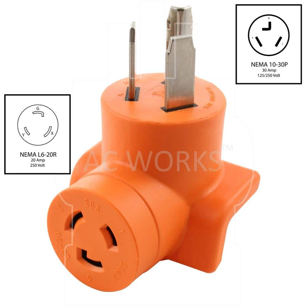This AC WORKS brand dryer outlet adapter [AD1030L620] is very durable with a compact design. It is a NEMA 10-30P to NEMA L6-20R. The NEMA 10-30P is a 30 Amp, 125-Volt/250-Volt, 3-prong dryer outlet plug. The NEMA L6-20R, 20 Amp, 250-Volt locking female connector. The product is heavy-duty, compact and contains nickel-plated plugs and terminals to prevent rusting. The maximum operational power is 5000-Watt.