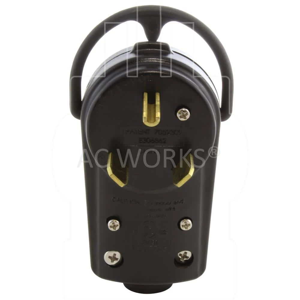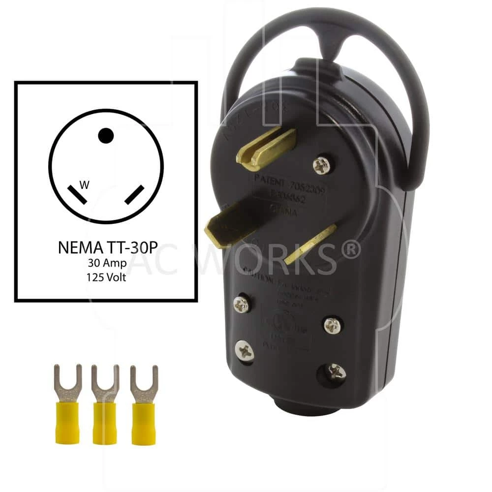 This AC WORKS brand, solid industrial grade wiring device [ASTT30P] is made of very durable construction able to withstand impacts, chemicals, and weather. It is a NEMA TT-30P, 30 Amp, 125 Volt straight-blade plug. This product features a strain relief structure with SJT, SJO, SOO, STW, 10/3 cable specifications. DIY products include a 1-year limited warranty.