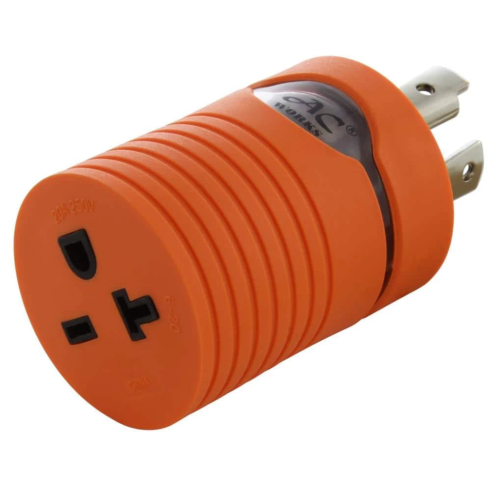 This AC WORKS brand locking adapter [ADL1430620] is durable with a compact design. The orange adapter is a NEMA L14-30P to NEMA 6-15/20R. The NEMA L14-30P is a 30 Amp, 125-Volt/250-Volt, 4-prong locking male plug. The NEMA 6-15/20R is a 15 Amp/20 Amp, 250-Volt female connector. The product is heavy-duty, compact, and contains nickel-plated pins and terminals to prevent rusting. The adapter also comes with a power indicator light around the entire product so you will always know when you are receiving power. Included with your purchase is a 5-year limited warranty.