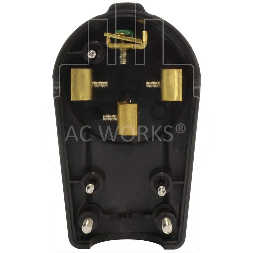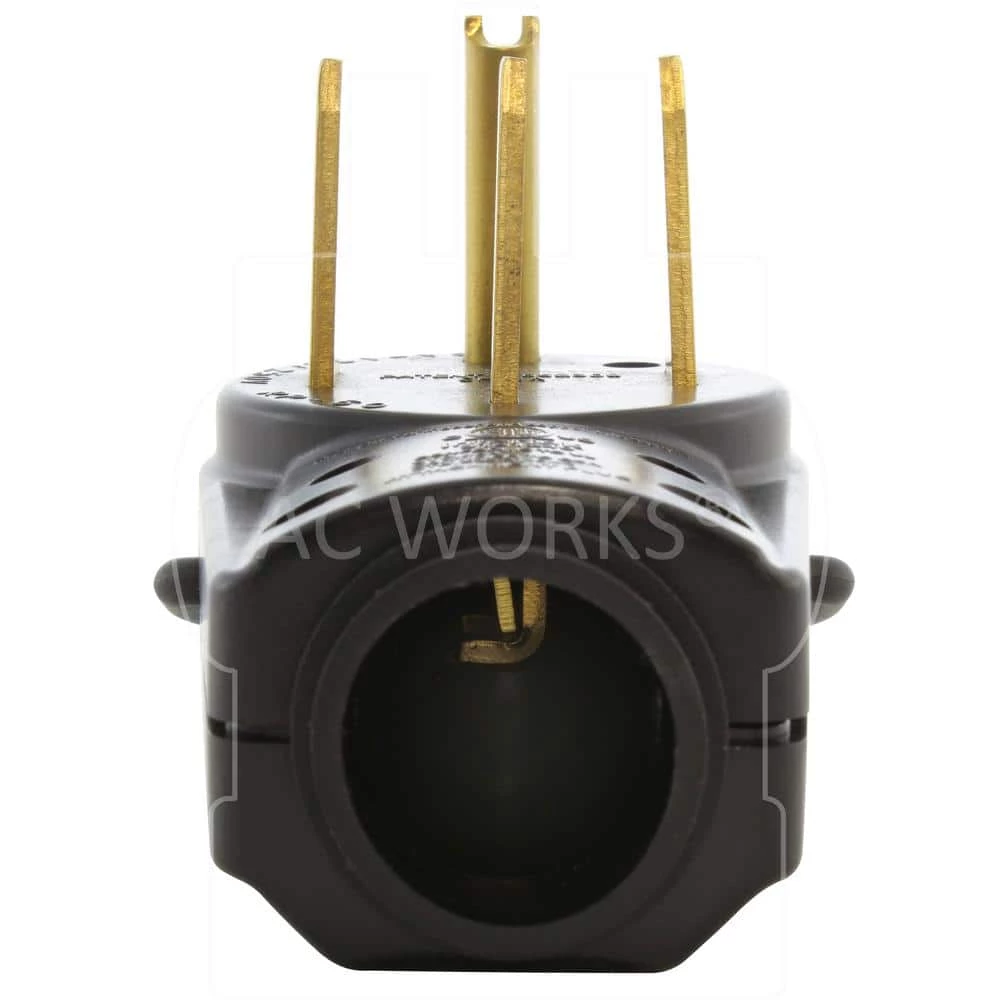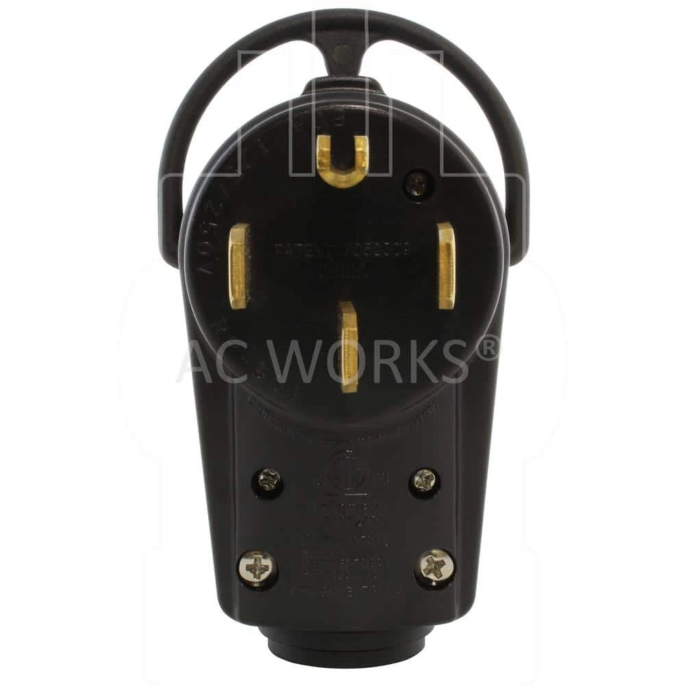 This AC WORKS brand, solid industrial grade wiring device [AS1450P] is made of very durable construction able to withstand impacts, chemicals and weather. It is a NEMA 14-50P, 50 Amp, 125-Volt/250-Volt straight-blade plug. This product features a strain relief structure with SJT, SJO, SOO, STW, 10/4, 8/4 and 6/4 cable specifications. DIY products include a 1-year limited warranty.