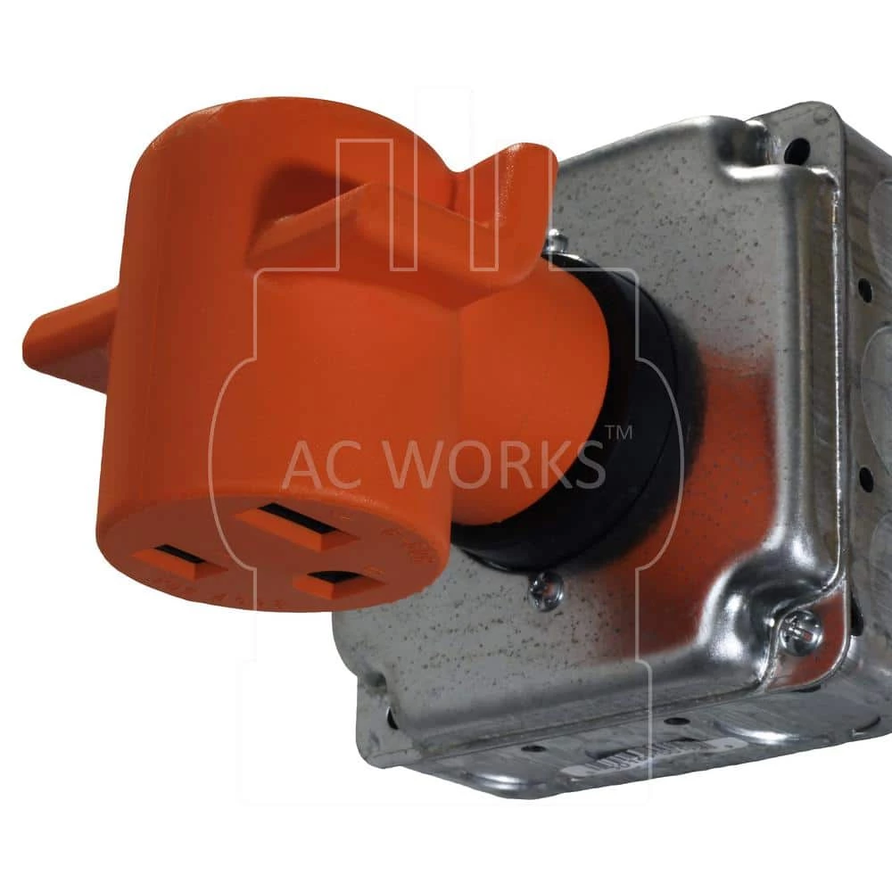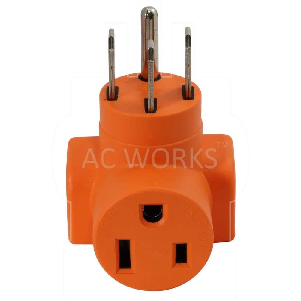 This AC WORKS brand welder adapter is a very durable compact adapter. This adapter is a NEMA 14-50P to NEMA 6-50R. The NEMA 14-50P is a 50 Amp, 125/250-Volt, 4-prong RV/Range/Generator male plug. The NEMA 6-50R is a 50 Amp, 250-Volt, 3-prong welder female outlet connector. The orange adapter is a heavy-duty compact, molded and durable adapter with nickel-plated pins and terminals to prevent rusting. Included with your purchase is a 5-year limited warranty.