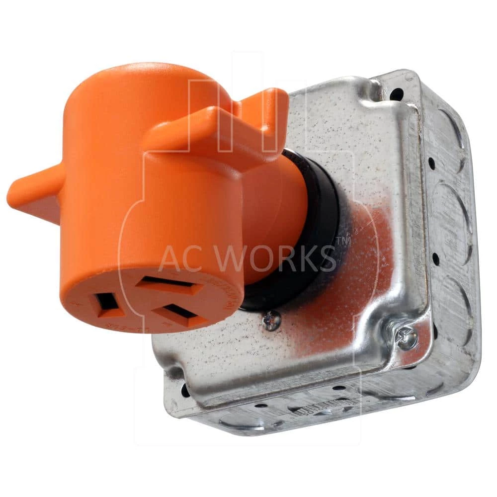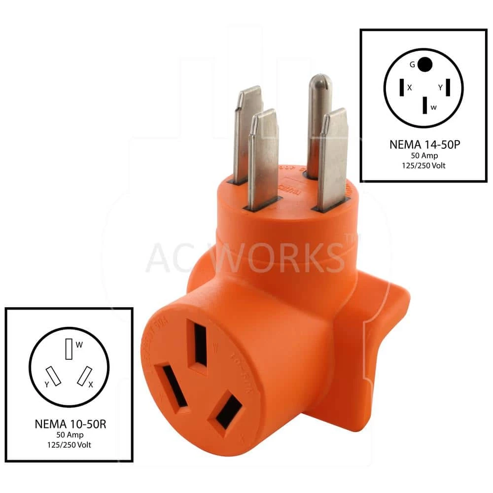 This AC WORKS brand heavy-duty welder adapter is very durable with a compact design. It is a NEMA 14-50P to NEMA 10-50R. The NEMA 14-50P is a 50 Amp, 125/250-Volt RV/Range/Generator male plug. The NEMA 10-50R is a 50 Amp, 125/250-Volt Welder female connector. This orange adapter has nickel-plated pins and terminals to prevent rusting. Included in your purchase is a 5-year limited warranty.