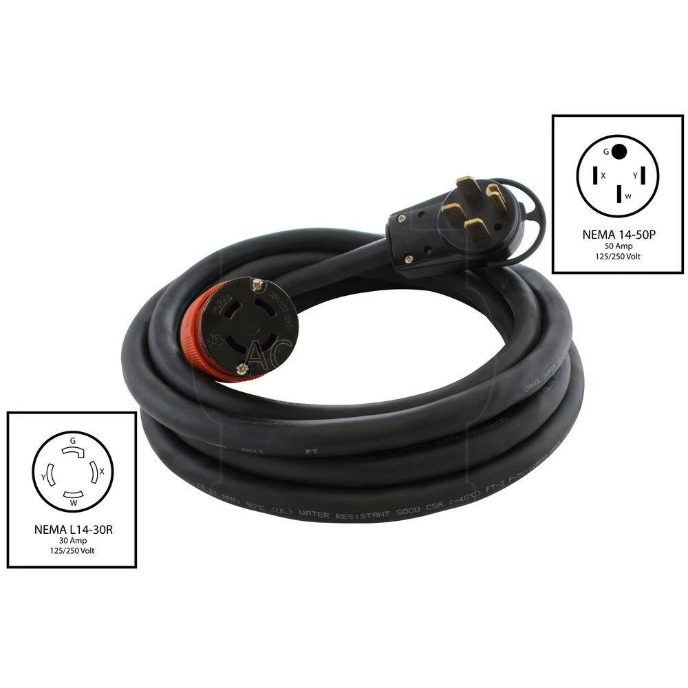 This AC WORKS brand 50 ft. adapter cord is very durable. It is a NEMA 14-50P to NEMA L14-30R. The NEMA 14-50P is a 50 Amp, 125/250-Volt, 4-prong straight-blade male plug. The NEMA L14-30R is a 30 Amp, 125/250- Volt, 4-prong locking female connector. The maximum operating power is 7500-Watt. Included in your purchase is a 5-year limited warranty.