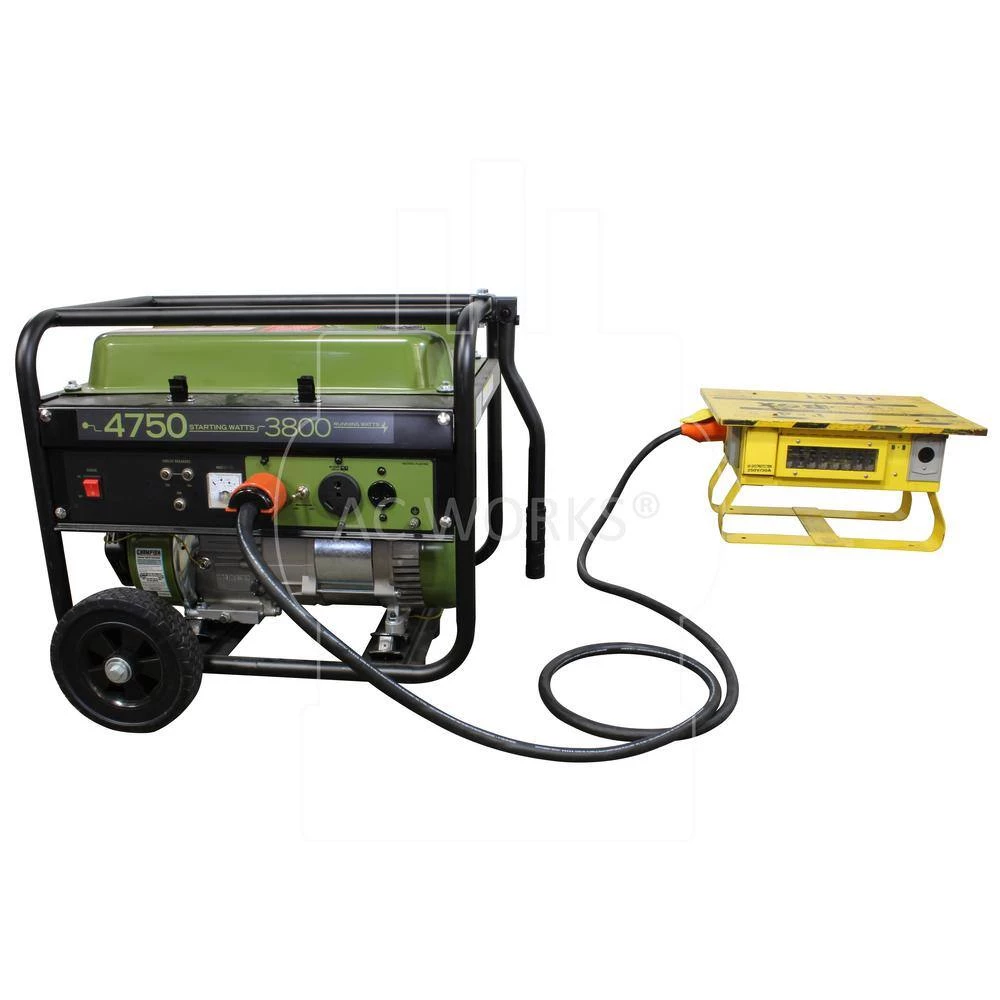 This AC WORKS brand 50ft temporary power adapter cord is very durable with SOOW, 10/4, 30 Amp copper wire, and a 600 Volt jacket. It is a NEMA L14-30 to CS6364. The NEMA L14-30 is a 30 Amp, 125/250 Volt, 4-prong locking male plug. The CS6364 is a 50 Amp, 125/250 Volt locking temporary female connector. The product is for heavy-duty outdoor use and its maximum operating power is 7500 Watts. This power connection cord is used for temporary power with a transfer switch. Included with your purchase is a 5-year limited