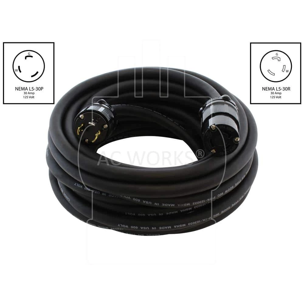 This AC WORKS brand 50 ft. L5-30 super-duty extension cord is popular for use with utility companies, emergency power, electric vehicle charging, RVs and food trucks, the cable is an Soow, 8/3, 40 Amp copper wire with a 600-Volt rubber jacket and reduces voltage drop over long distances, the jacket is anti-cold weather, staying flexible in extreme temperatures. This product is backed by a 5-year limited warranty.