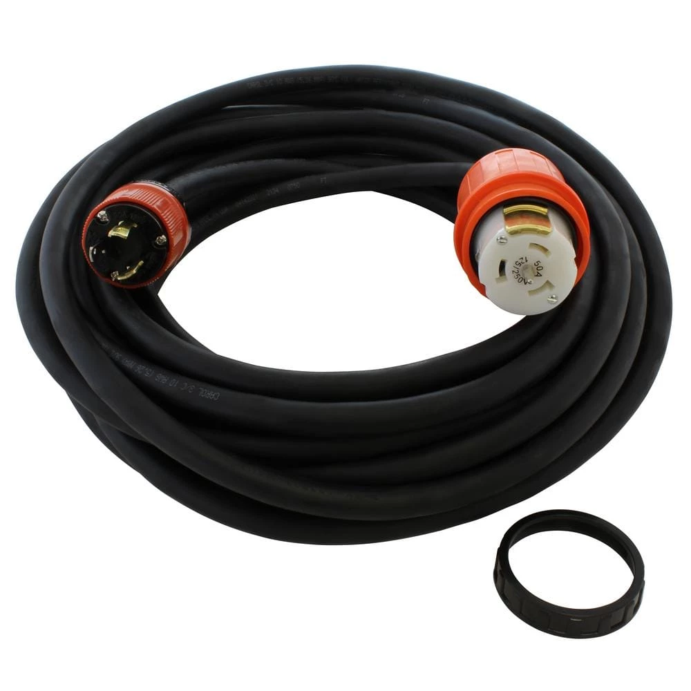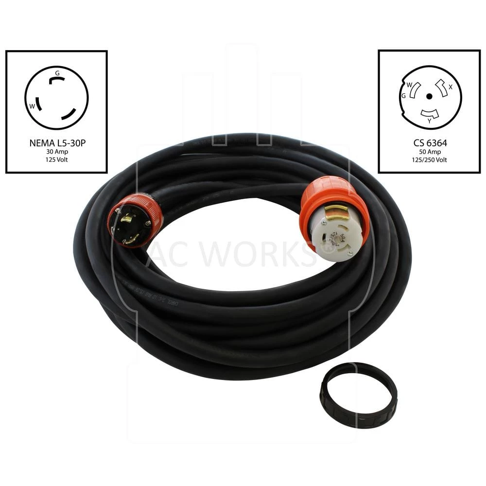 This AC WORKS brand 50 ft. temporary power cord is very durable with SOOW 10/3 30 Amp copper wire and a 600-Volt jacket. It is a NEMA L5-30 to CS6364. The NEMA L5-30 is a 30 Amp, 125-Volt, 3-prong locking male plug. The CS6364 is a 50 Amp, 125-Volt/250-Volt locking temporary female connector. The product is for heavy-duty outdoor use and its maximum operating power is 3750-Watt. This power connection cord is used for temporary power with a transfer switch. Included with your purchase is a 5-year limited warranty.