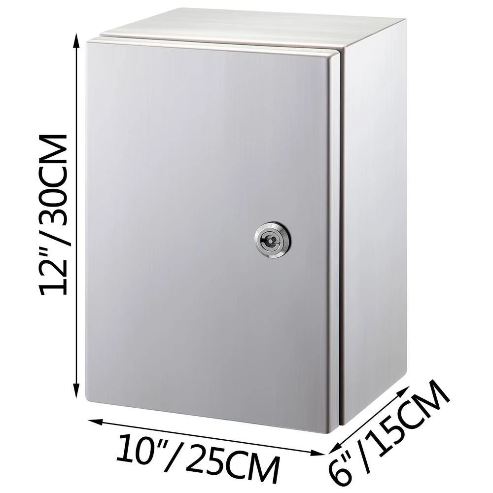 The VEVOR 12 in. x 10 in. x 6 in. Stainless Steel Electrical Enclosure Box. The VEVOR electrical box comprises professional 304 stainless steel, with a sophisticated lock core, high-strength hinge, sealing rubber strip, and IP66 protection level to well-protect the internal electrical in harsh environments. It can be widely used for indoor and outdoor applications to protect circuits from liquids and corrosion, such as electricity, construction, hotel, and other industries.