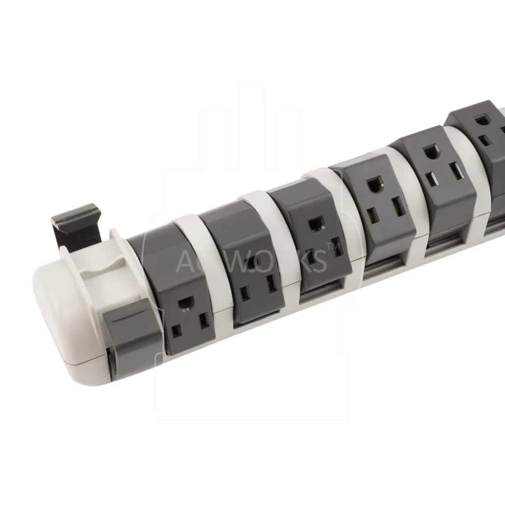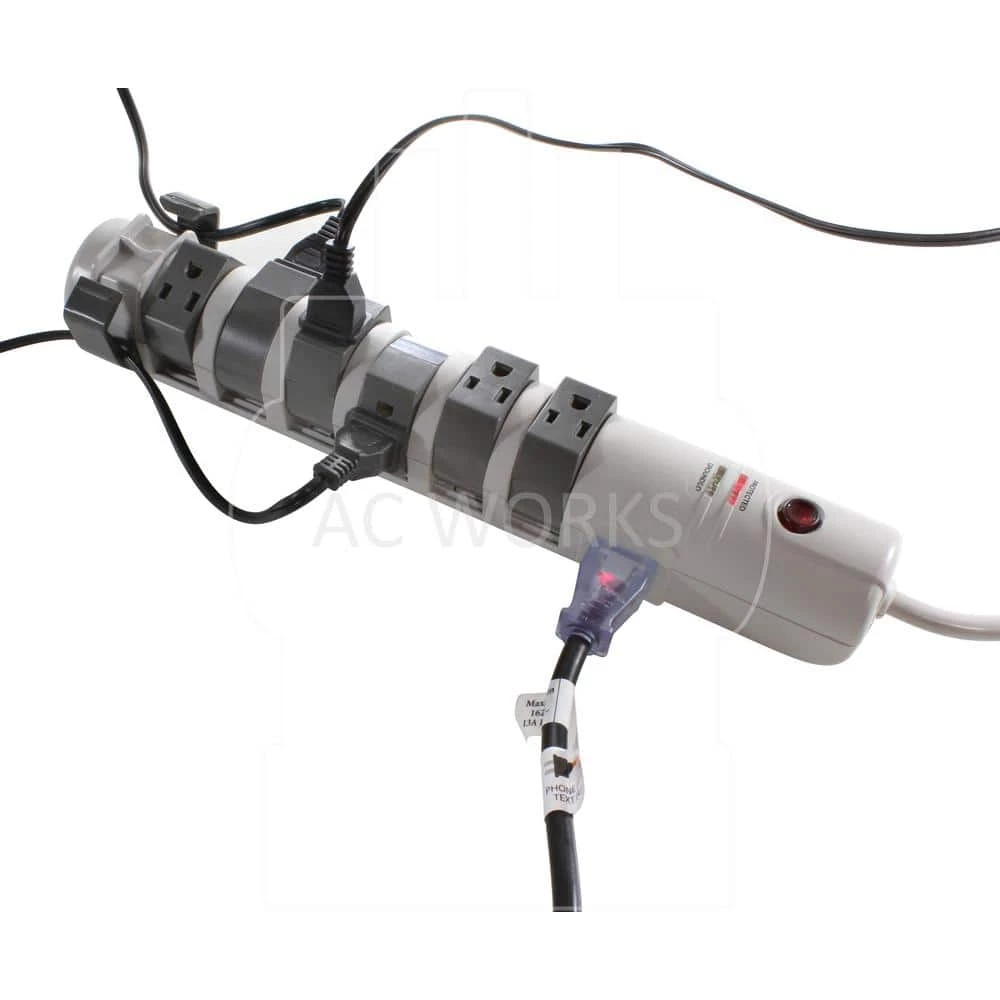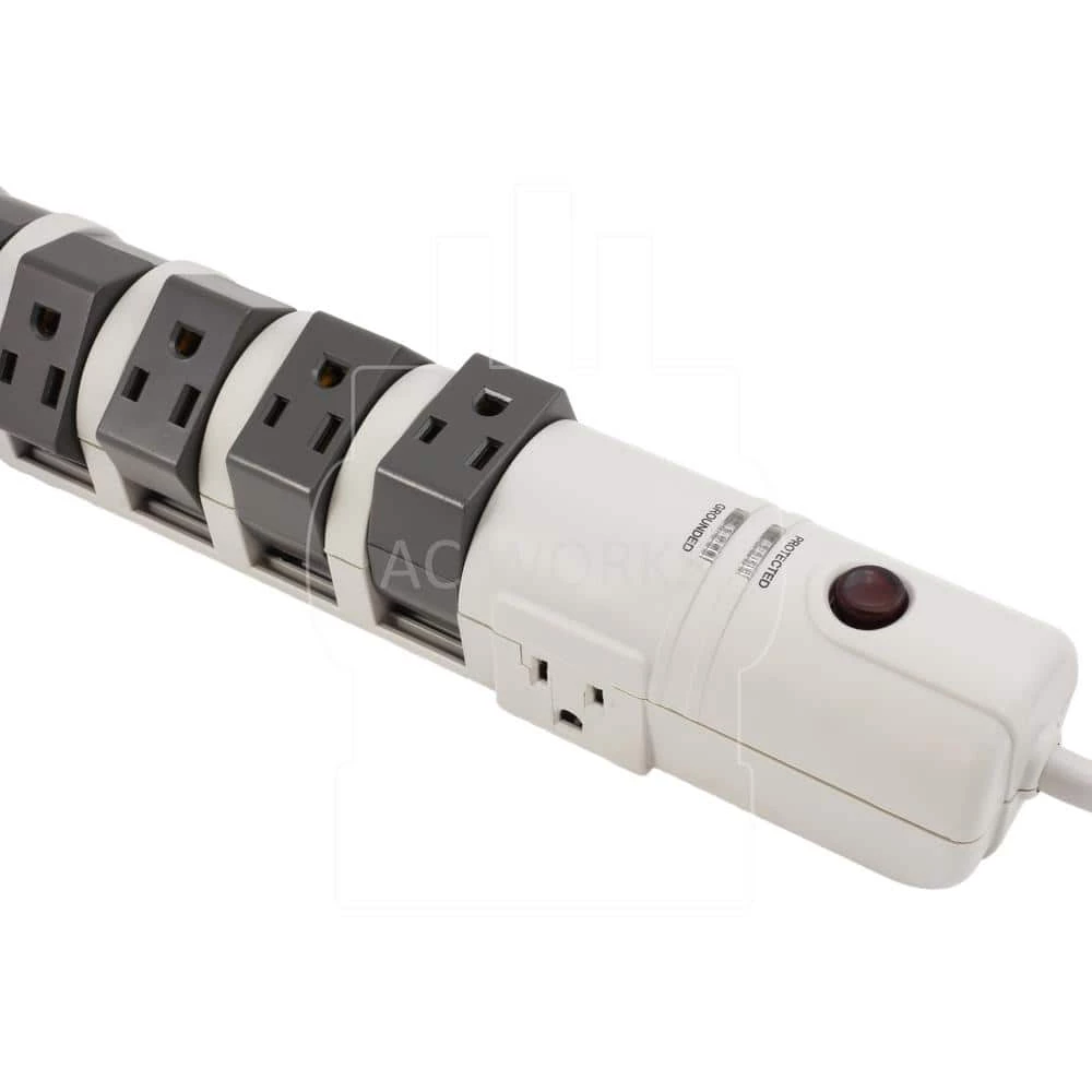 This AC WORKS brand 6-foot SJT, 14/3, 15 Amp, Power Strip has 8 Rotating Outlets with Surge Protection. The PSROT-072 model power strip features the domestic, 3-prong, 360° rotating North American plug NEMA 5-15P and six, 180° rotating NEMA 5-15R North American receptacles along with two fixed NEMA 5-15R receptacles. This product also features a 6 ft. power cord and a lighted power switch. The six rotating outlets prevent AC/DC converters and other bulky plugs from bumping into each other, allowing you to make the most out of your space. The cable management system guides your power leads away from the strip in an organized manner, helping to reduce clutter and tangling.