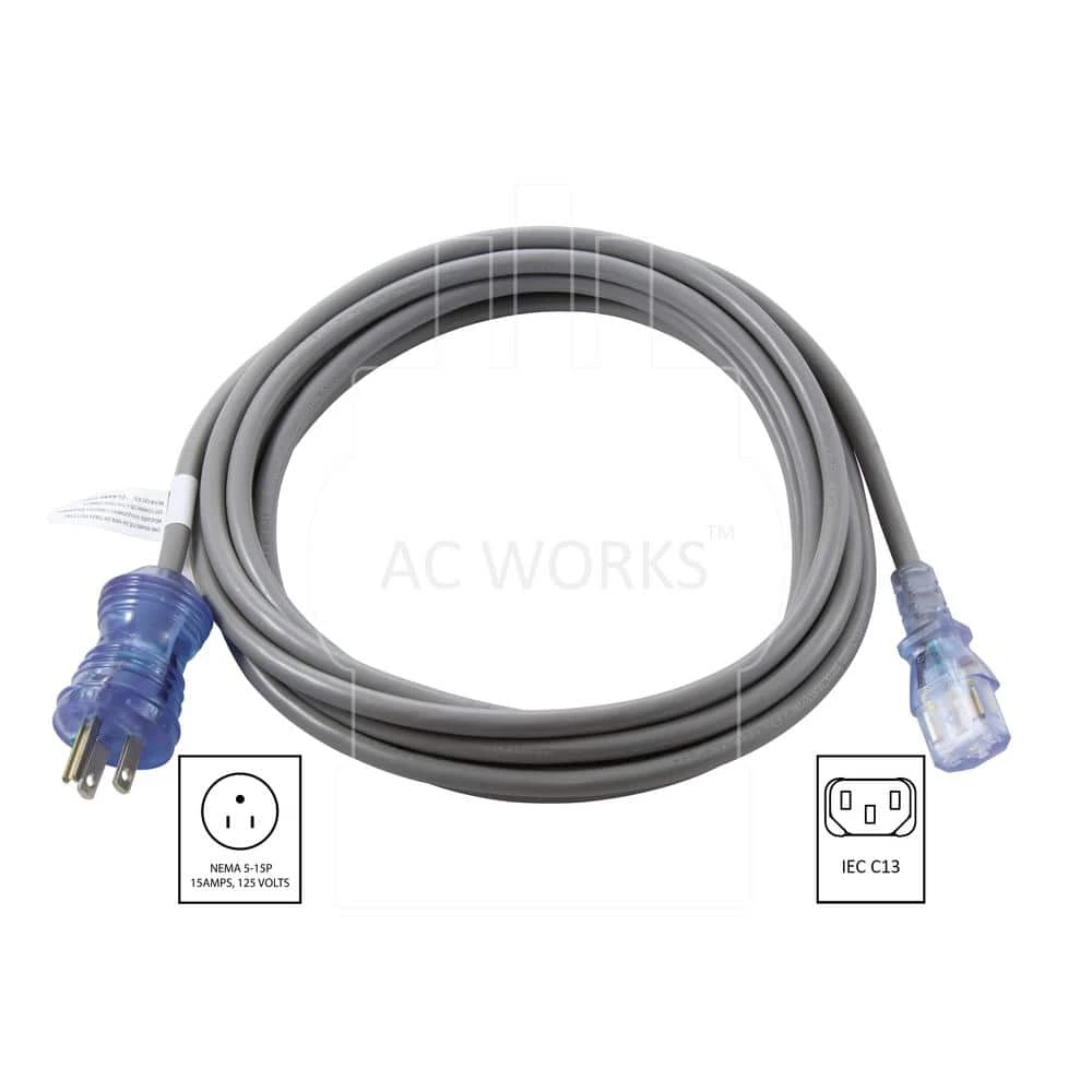 This AC WORKS brand medical grade power cord is 15 ft. in length. It is a NEMA 5-15P to IEC C13. The cord is an SJTW, 18/3 hospital grade power supply cord. This green dot medical power supply cord has a NEMA 5-15P, 15 Amp, 125-Volt medical grade plug connected to an IEC C13 computer/medical devices/IT/CPU/server end.