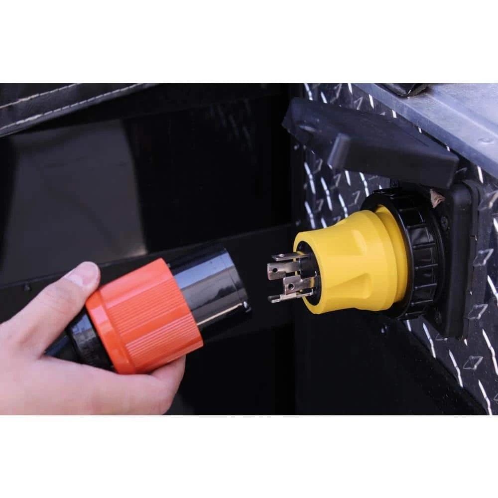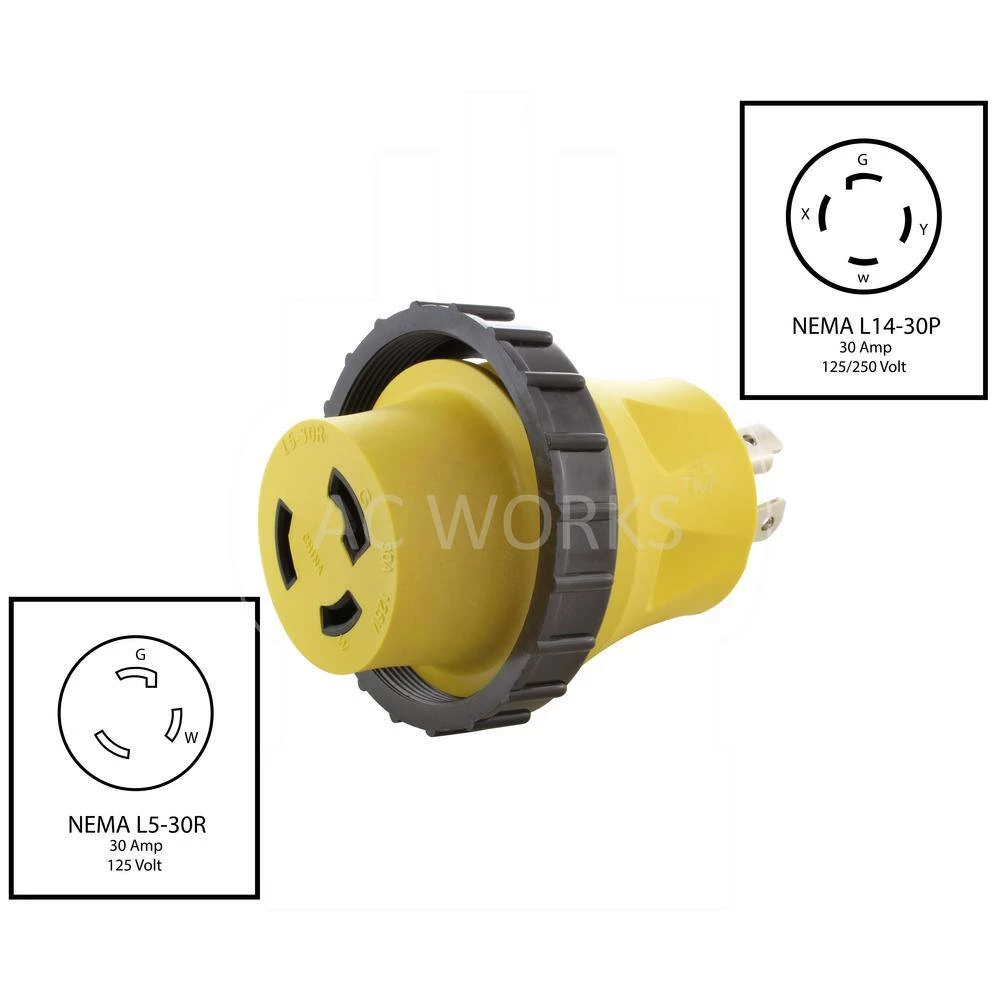 This AC WORKS brand RV/Marine generator adapter [RVL1430M30] is very durable with a compact design. The yellow adapter is a NEMA L14-30P to a NEMA L5-30R. The NEMA L14-30P is a 30 Amp, 125/250 Volt, 4-prong locking male plug. The NEMA L5-30R is a 30 Amp, 125 Volt, 3-prong locking female connector. The pins and terminals are nickel-plated to prevent rusting. Included with your purchase is a 5-year limited warranty.