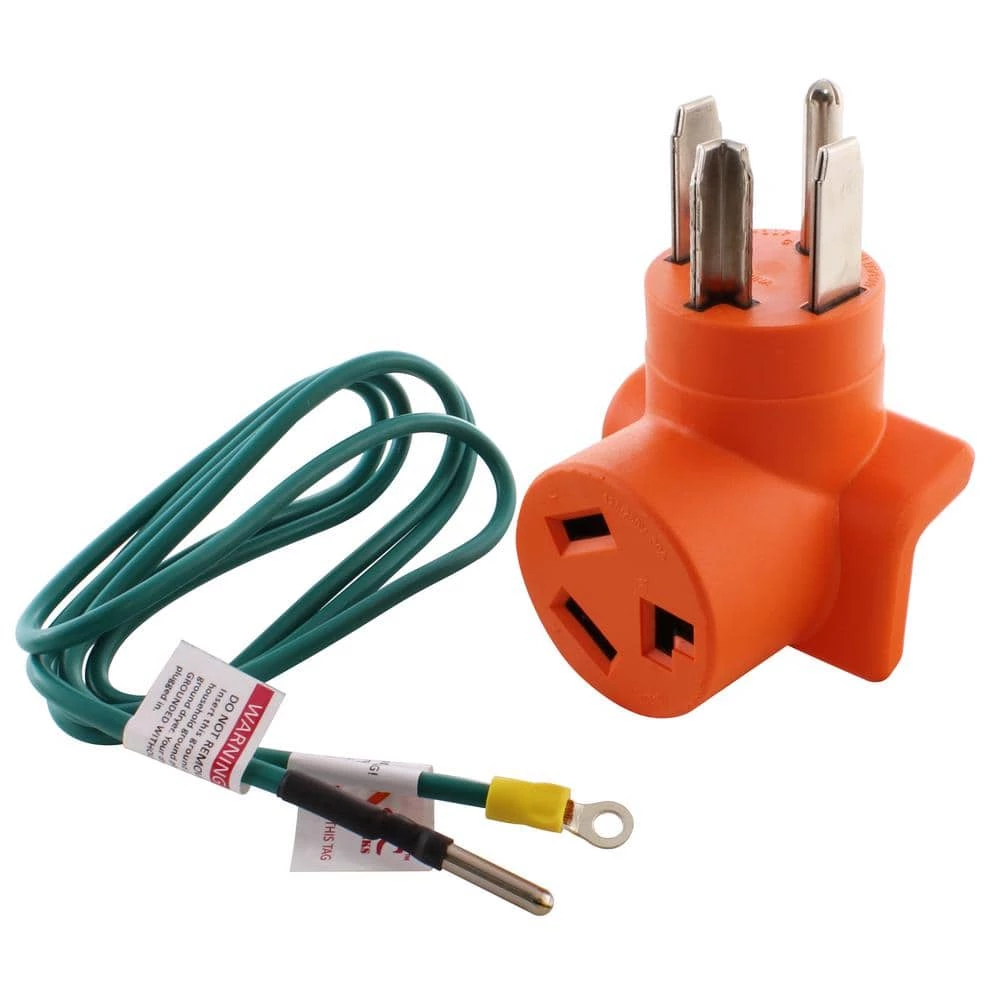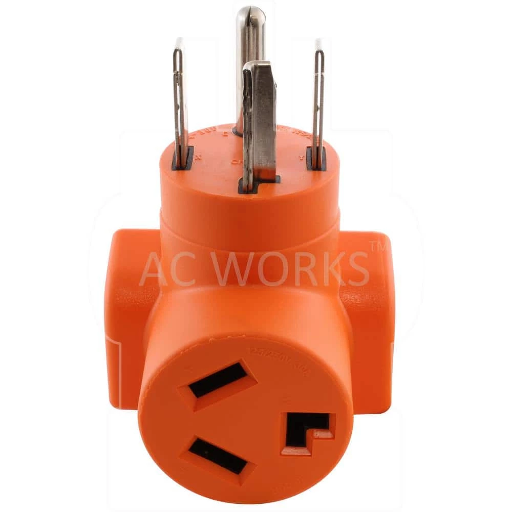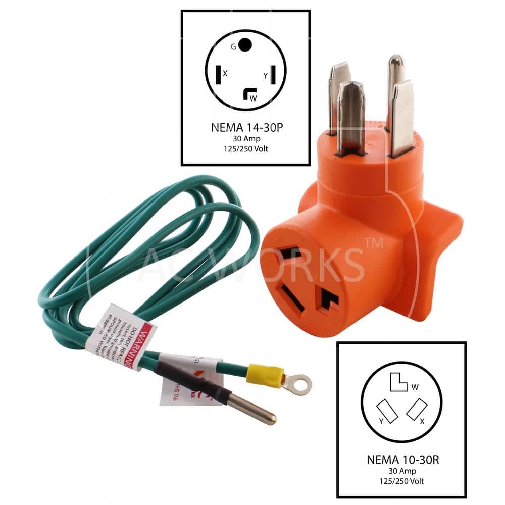 This AC WORKS brand compact dryer adapter. This adapter has a NEMA 14-30P, 4-Prong, NEW dryer plug connecting to a 3-Prong, NEMA 10-30R Old dryer outlet. This orange adapter also comes with a grounding cable allowing you to ground your dryer for safety and it features a 5-year limited warranty.