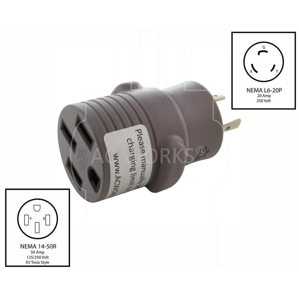 This AC WORKS brand electric vehicle charging adapter [EVL620SS] is compact and durable. The adapter is a NEMA L6-20P to NEMA 14-50R. The NEMA L6-20P is a 20 Amp, 250 Volt locking male plug. The power source for charging is a 20 Amp, 250 Volt, NEMA L6-20R industrial outlet. This adapter is wired specifically for compatibility with a Tesla charger. This product includes a 5-year limited warranty.
