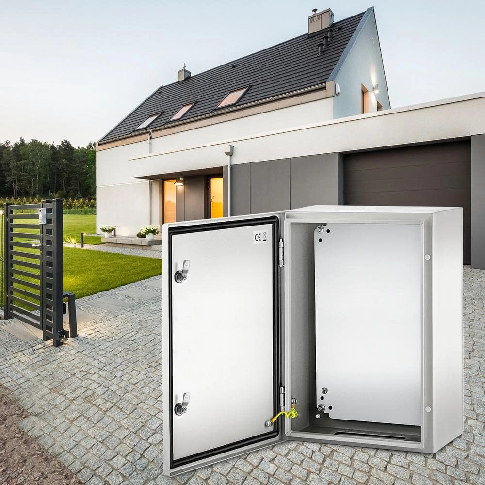 The VEVOR 24 in. x 16 in. x 12 in. Carbon Steel Electrical Enclosure Box. The VEVOR electrical box comprises premium carbon steel, with a sophisticated lock core, high-strength hinge, sealing rubber strip, and IP65 protection level to well-protect the internal electrical safety in harsh environments. It is widely used for indoor and outdoor applications to protect circuits from liquids and corrosion, such as electricity, construction, hotel, and other industries.