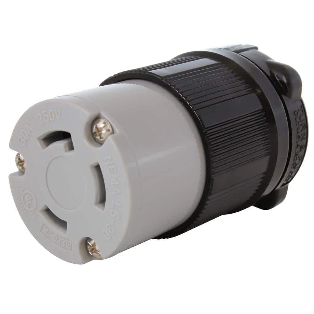 This AC WORKS brand gray NEMA L6-30R wiring device is made of a very durable construction able to withstand impacts, chemicals and weather. It has a weather-tight seal and strain relief structure with SJT, SJO, SOO, STW 12/3, 10/3 or bigger cable. This product features a locking connector, preventing items from becoming unplugged when in use. DIY products have a 1-year limited warranty.