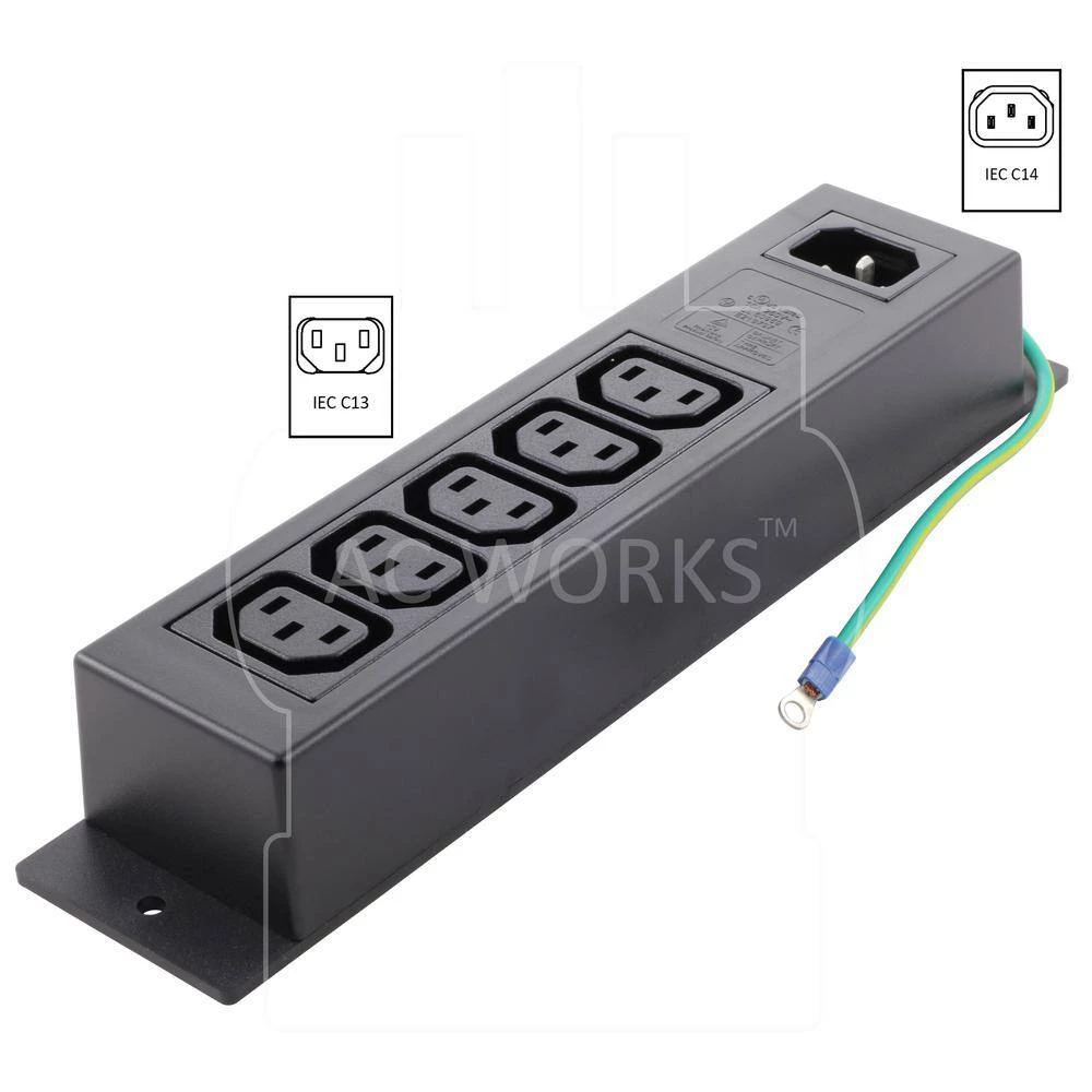 This AC WORKS brand IT/ Server Power Strip [WS-045-0-4WG] is a heavy-duty quality product. It is an IEC IT/ Server/ PDU Power Strip. It has 7.5 in. Housing IEC C14 Power input Inlet to (5) IEC C13 Sheet F outlets with a grounding wire. It is commonly used in IT/ Server for power distribution units. This product is backed by a 5-year limited warranty.