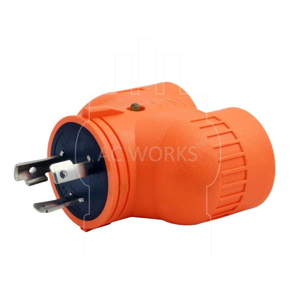 This AC WORKS brand V-DUO is a super durable adapter featuring a compact design. The adapter is NEMA L6-30P, 30 Amp, 250-Volt, 3-prong locking male plug to two NEMA L6-30R, 30 Amp, 250-Volt female connectors. It features nickel-plated plugs and terminals to prevent copper rusting, a total maximum operating power of 7500-Watt and a five-year limited warranty.