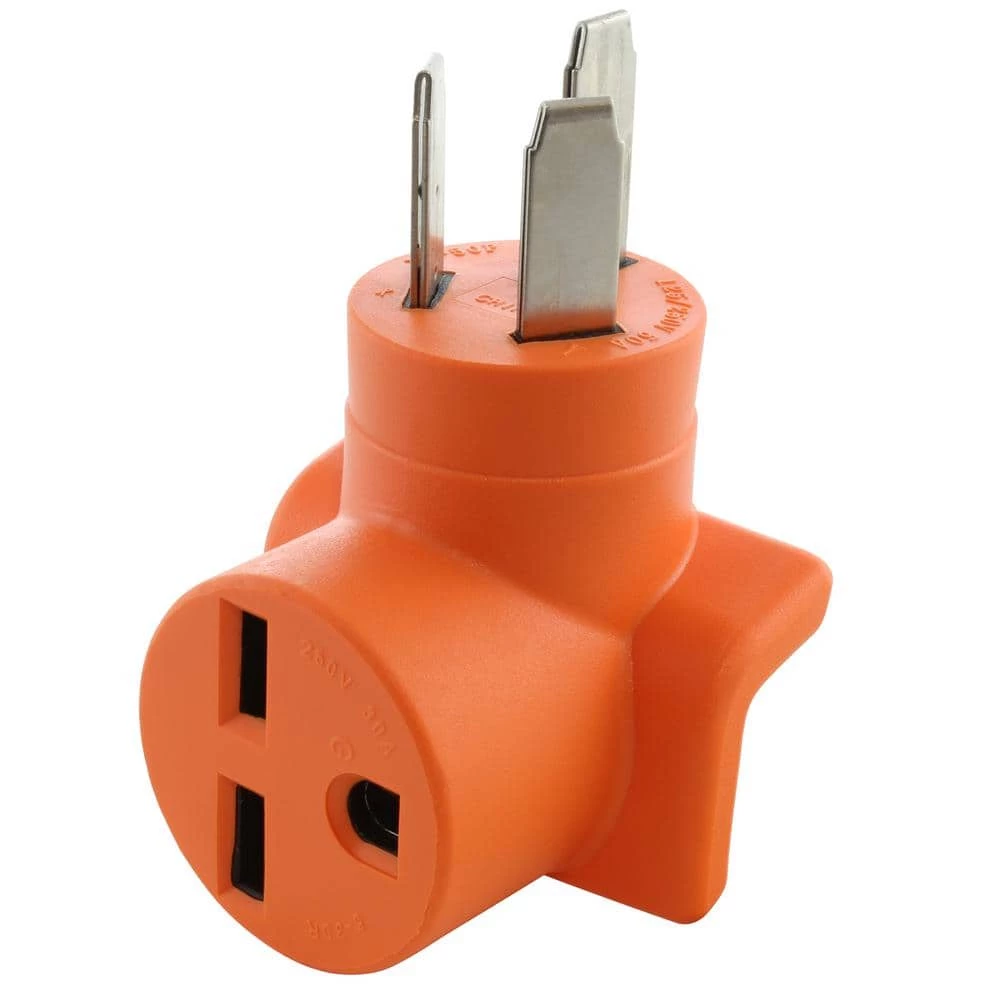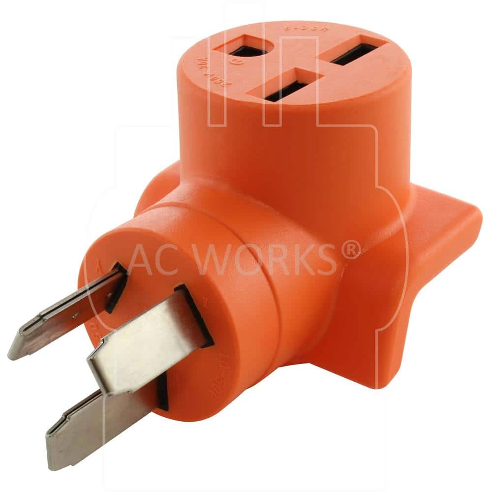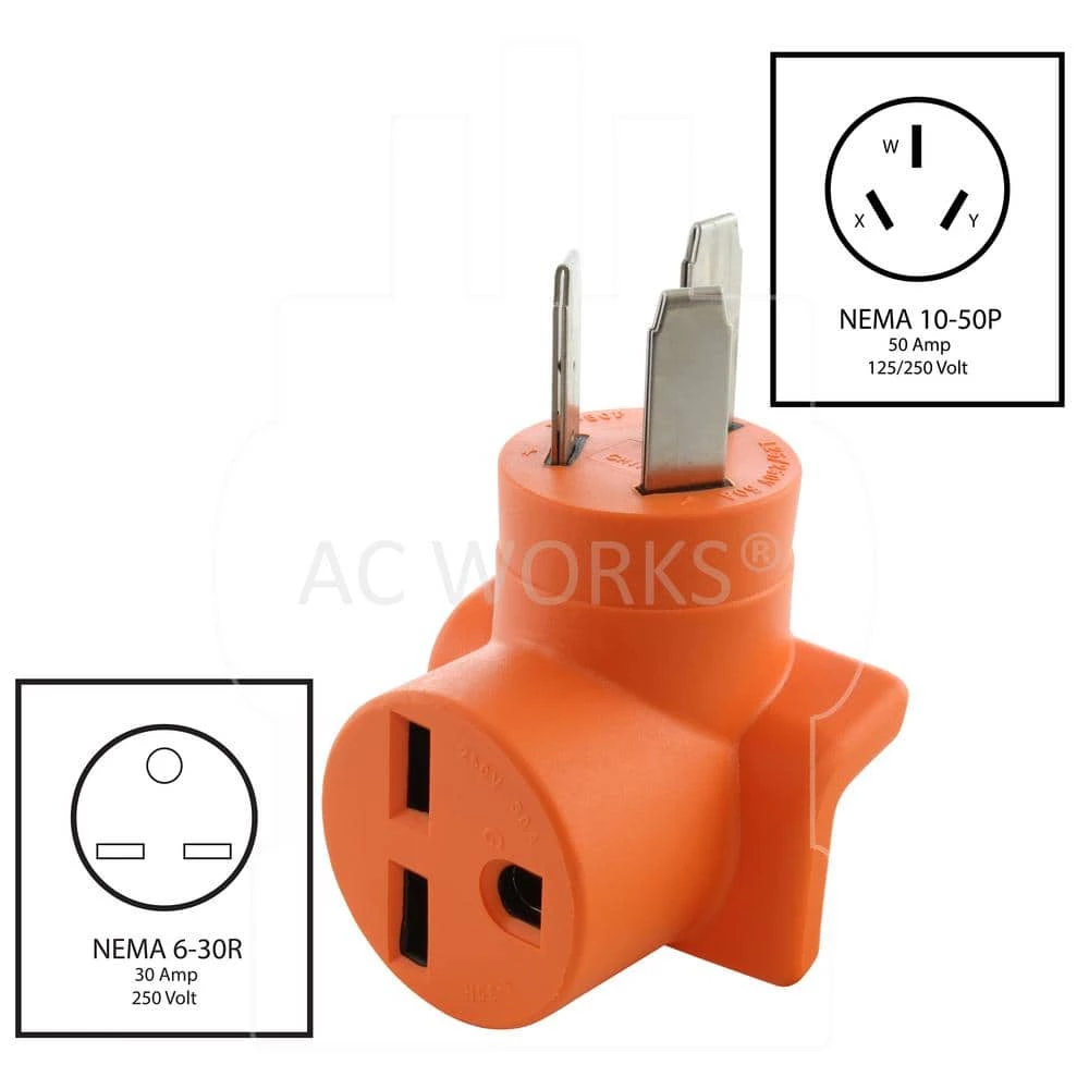 This AC WORKS brand product [AD1050630] is a super durable and compact adapter. It is a NEMA 10p-50p to a NEMA 6-30R. The NEMA 10p-50p is a 50 Amp, 250-Volt, 3-prong old range or dryer male plug. The NEMA 6-30R is a 250-Volt, 30 Amp commercial HVAC adapter. The pins and terminals are nickel-plated to prevent the copper from rusting and the adapter has a maximum power output of 7500-Watt. Included with this purchase is a 5-year limited warranty.