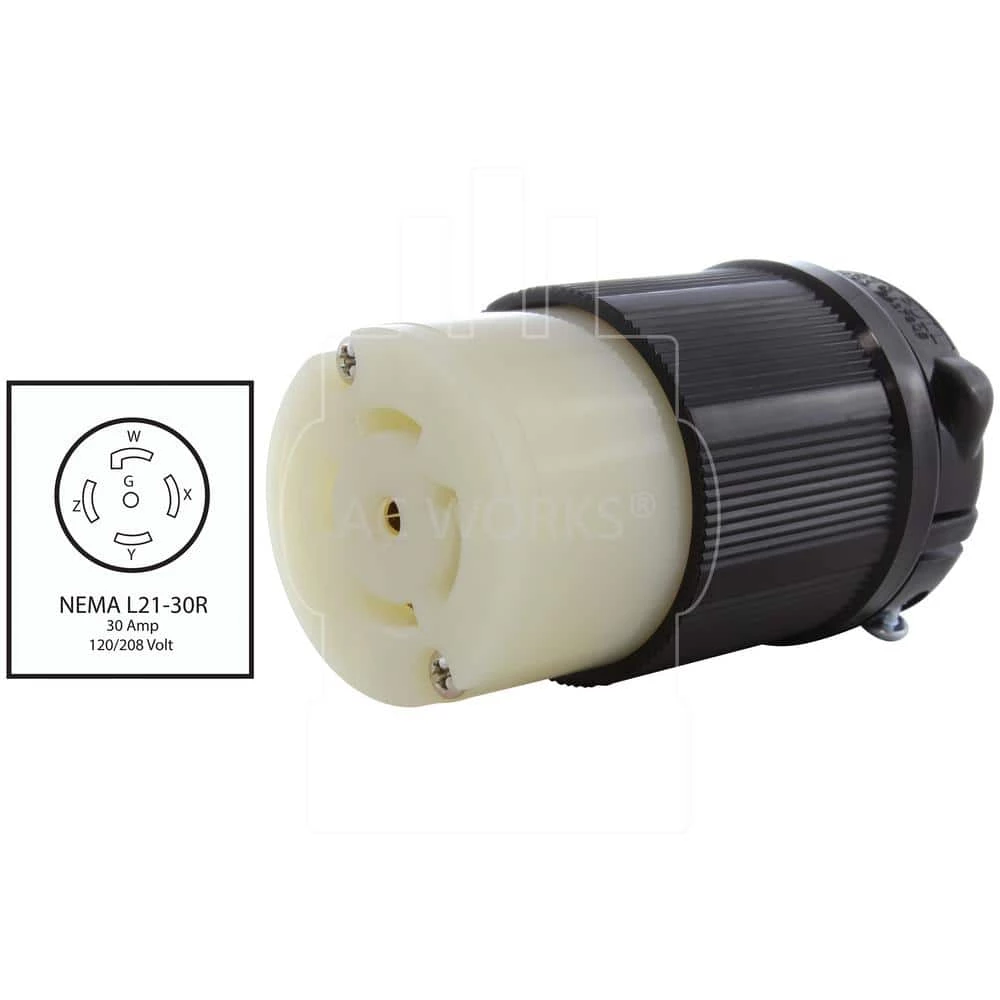 - NEMA L21-30R 30 Amp 3-phase 120/208-Volt 3PY, 5-wire locking female connector