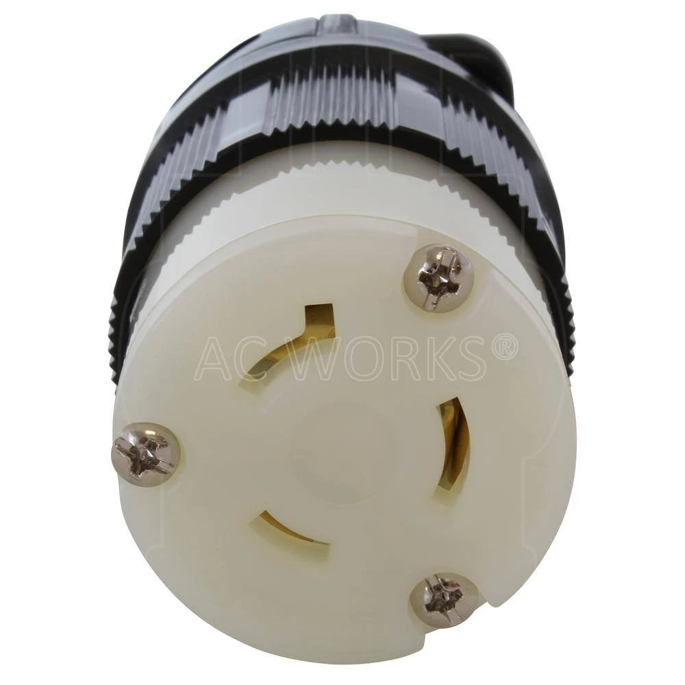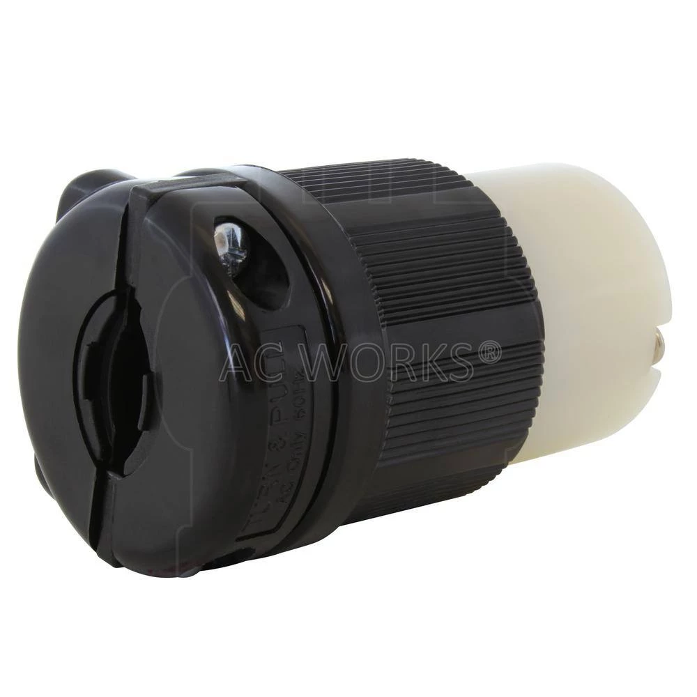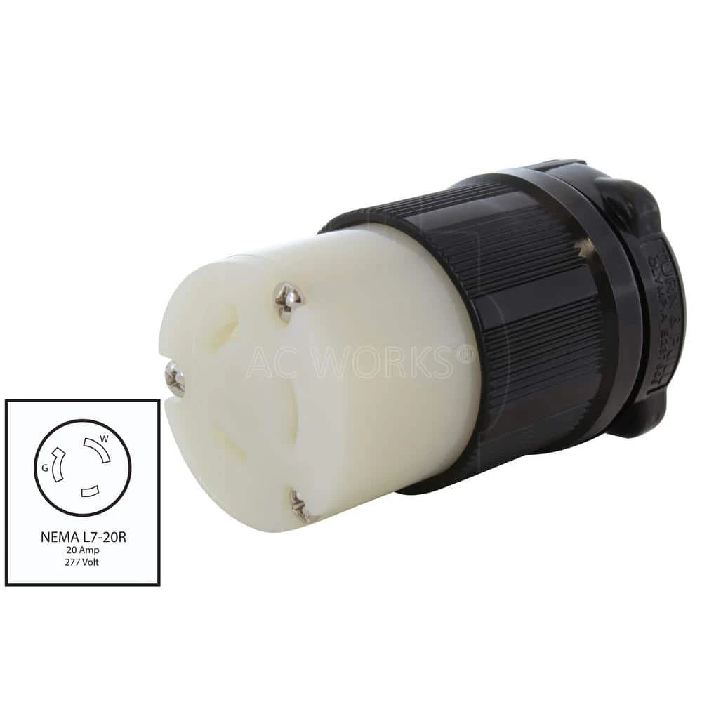 This AC WORKS brand NEMA L7-20R wiring device [ASL720R-BK] is made of a very durable construction able to withstand impacts, chemicals, and weather. It has a weather-tight seal and a strain relief structure with SJT, SJO, SOO, STW 12/3, 10/3, or bigger cable specifications. This product features a locking connector, preventing items from becoming unplugged when in use. DIY products have a 1-year limited warranty.