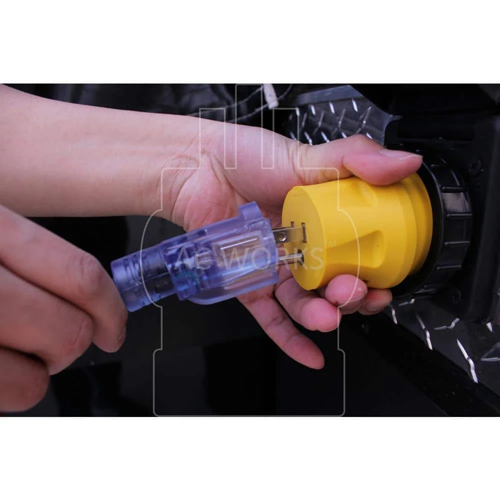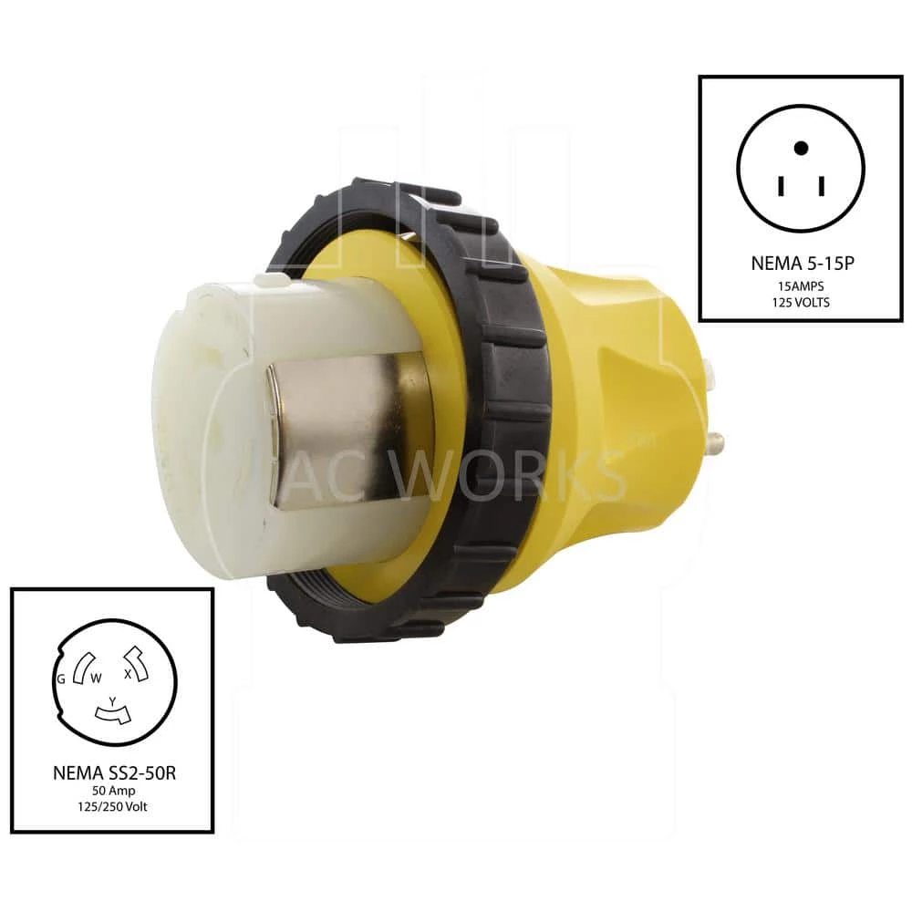 This AC WORKS brand RV/Marine adapter [RV515SS2] is a very durable molded adapter. It is a NEMA 5-15P to NEMA SS2-50R. The NEMA 5-15P is a regular household 15 Amp male plug. The NEMA SS2-50R is a 50 Amp, 125/250 Volt female connector. The pins and terminals are nickel-plated to prevent rusting and the maximum operating power is 1875 Watts. Included with your purchase is a 5-year limited warranty.