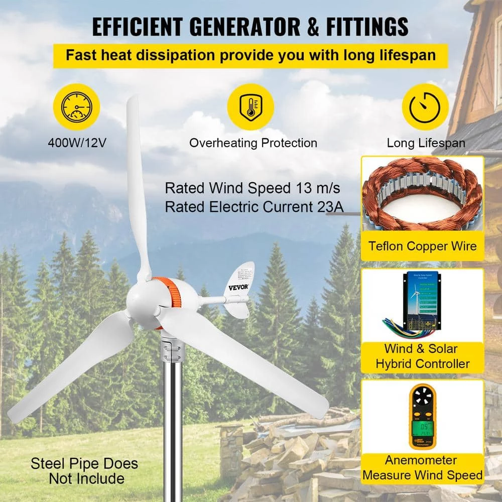 The VEVOR wind generator comprises a high-quality aluminum body, a stainless steel tail and a nylon carbon fiber blade. The turbine adopts a 3-phase magnet motor, external wind & solar hybrid controller and installed hoop to provide you with high power efficiency and effortless installation. In addition, the turbine features low start-up speed, high wind energy utilization, low vibration and a beautiful appearance, suitable for marine, boat, backyard and other home charging usage.